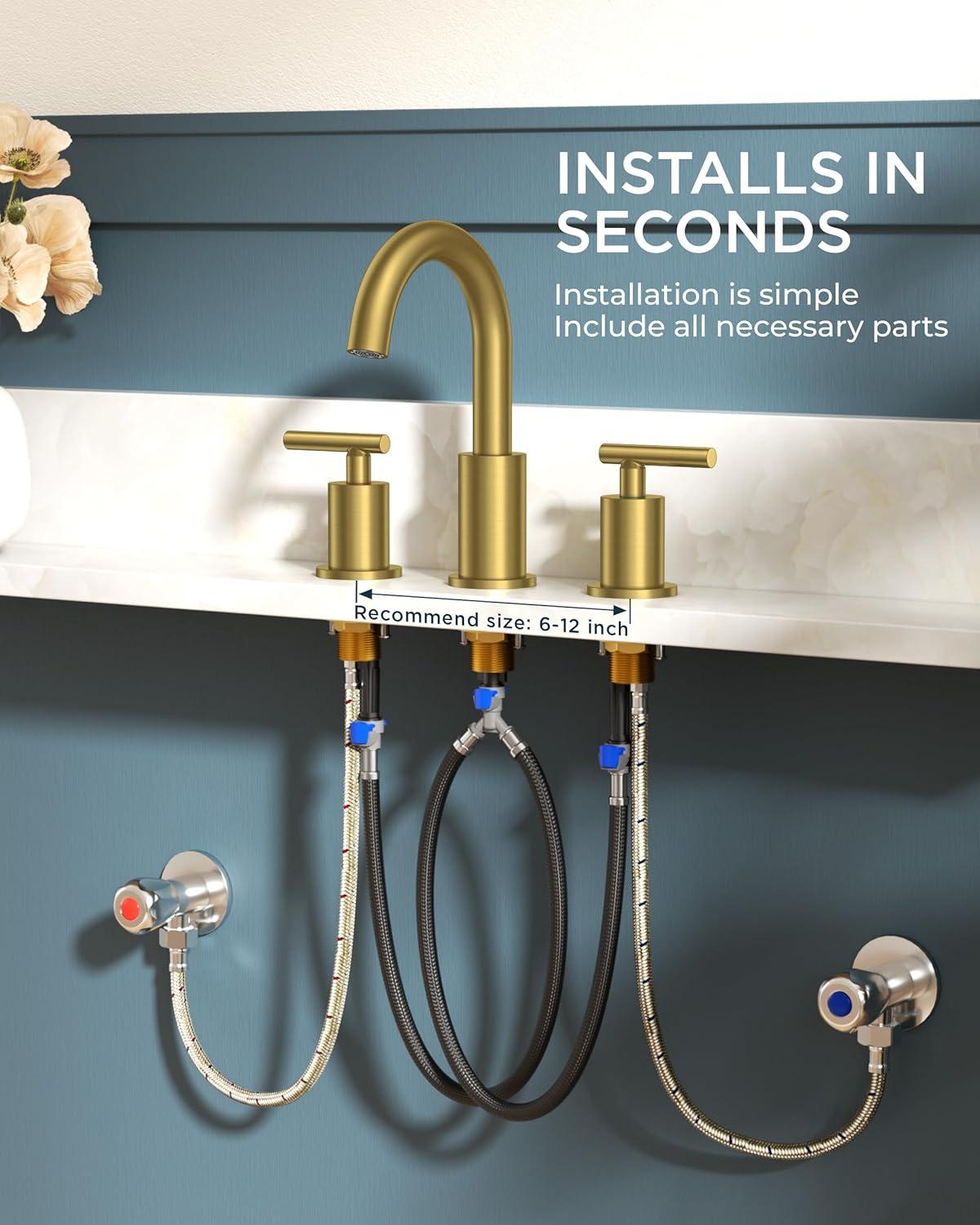 FORIOUS 2 Pack Black Bathroom Faucet 3 Hole, 8″ Widespread Matte Black Bathroom Sink Faucet with 360°Swivel Spout, Suitable for 6-12 Inch Vanity Sink, with Metal Pop-up Drain and Supply Line(Brushed Gold)
