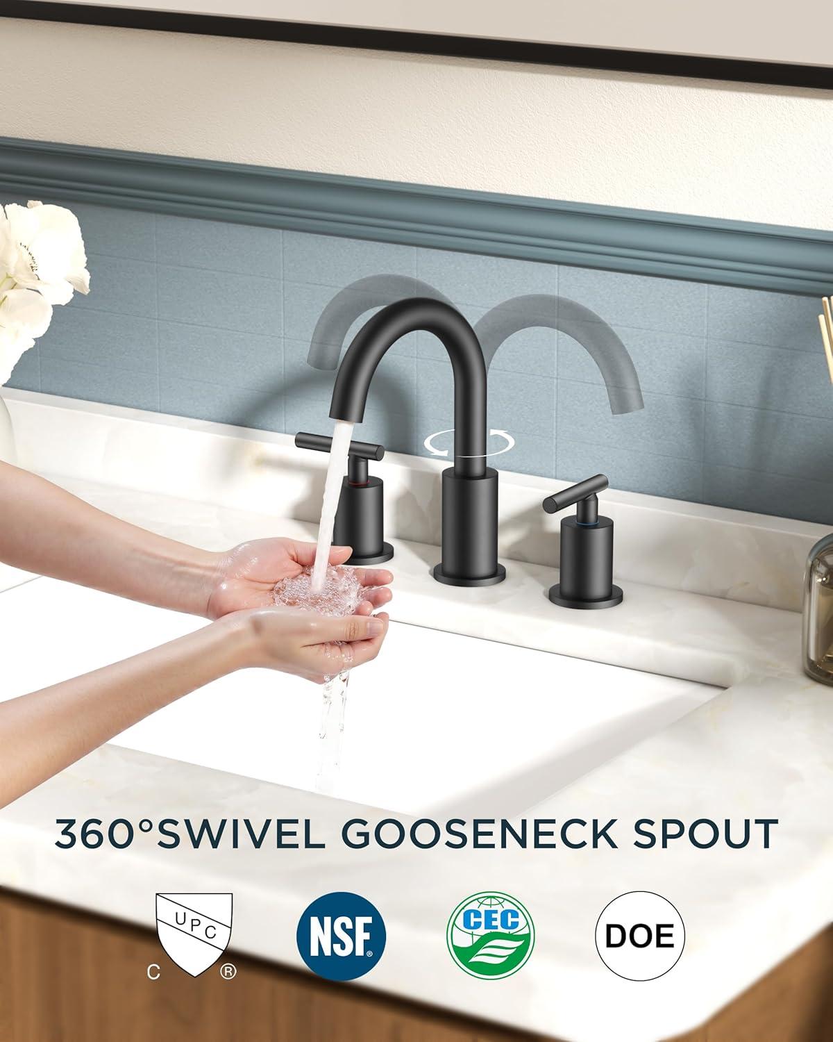 FORIOUS 2 Pack Black Bathroom Faucet 3 Hole, 8″ Widespread Matte Black Bathroom Sink Faucet with 360°Swivel Spout, Suitable for 6-12 Inch Vanity Sink, with Metal Pop-up Drain and Supply Line(Matte Black)