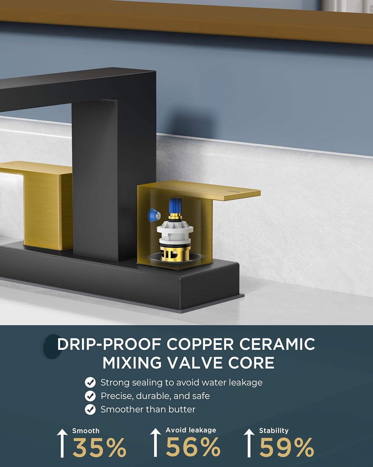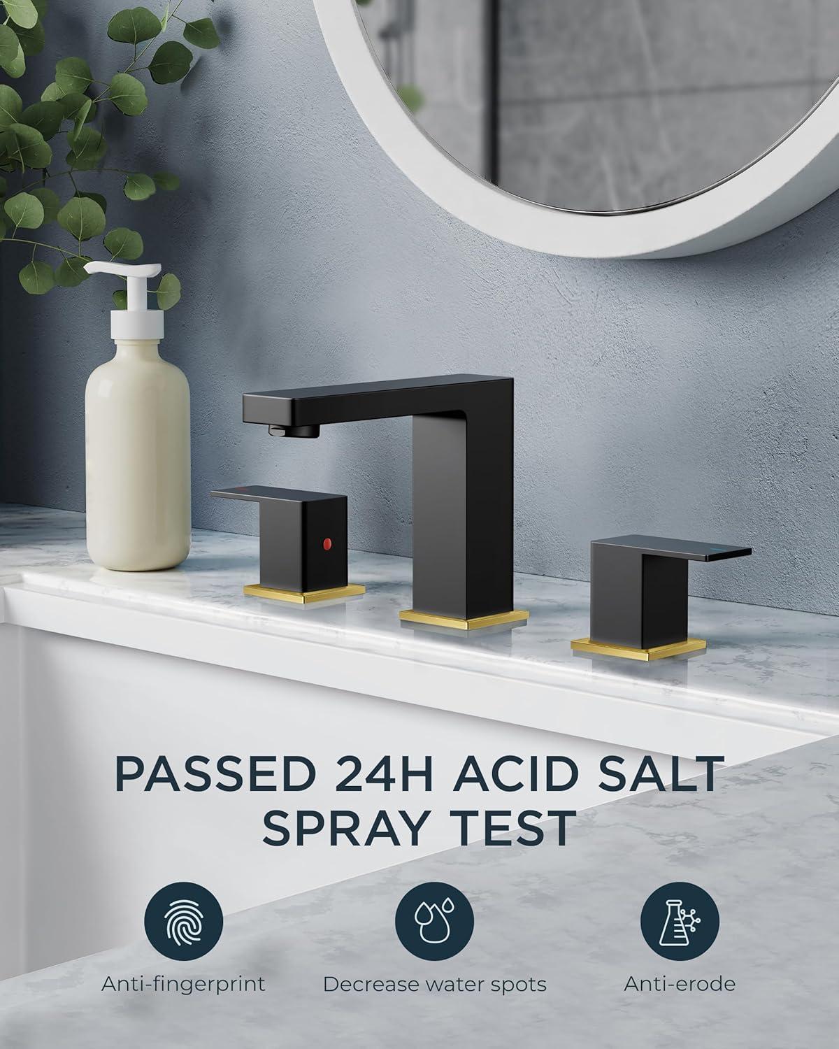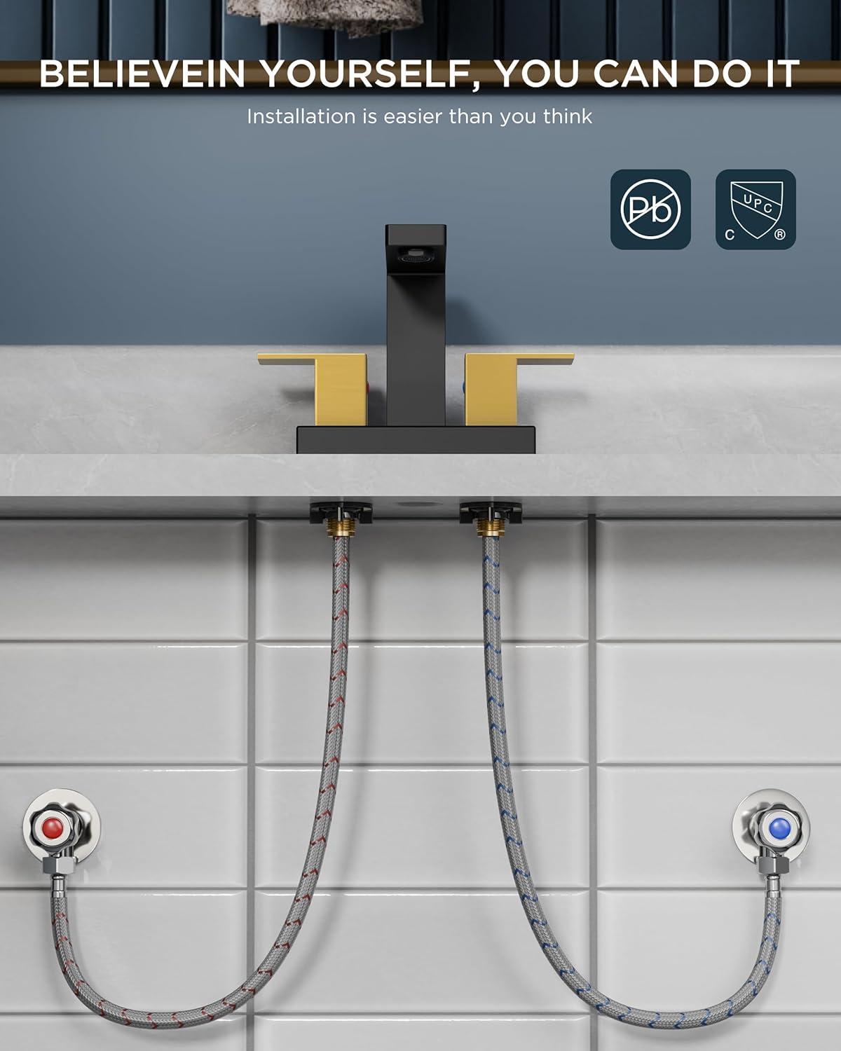 FORIOUS 2 Pack Gold Bathroom Faucet 3 Hole, Square 2 Handle 8 in Widespread Brushed Gold Bathroom Sink Faucet 3 Hole with Metal Drain, 24″ CUPC Supply Lines and Spare Aerator(Black&Gold)