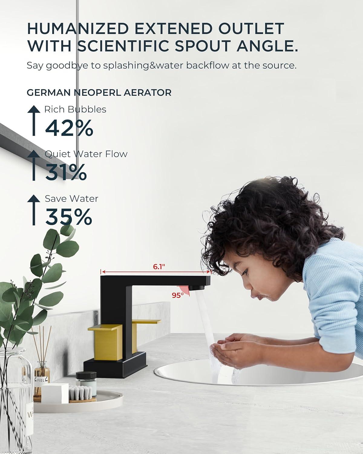 SPLASHGUARD 95° SPOUT: Fluid-dynamics spout with 6.26″ reach eliminates countertop mess. Lab-verified 95° nozzle bathroom gold faucet reduces 49% splashback vs general bathroom faucet – ideal for busy households with kids. Practical&user – friendly