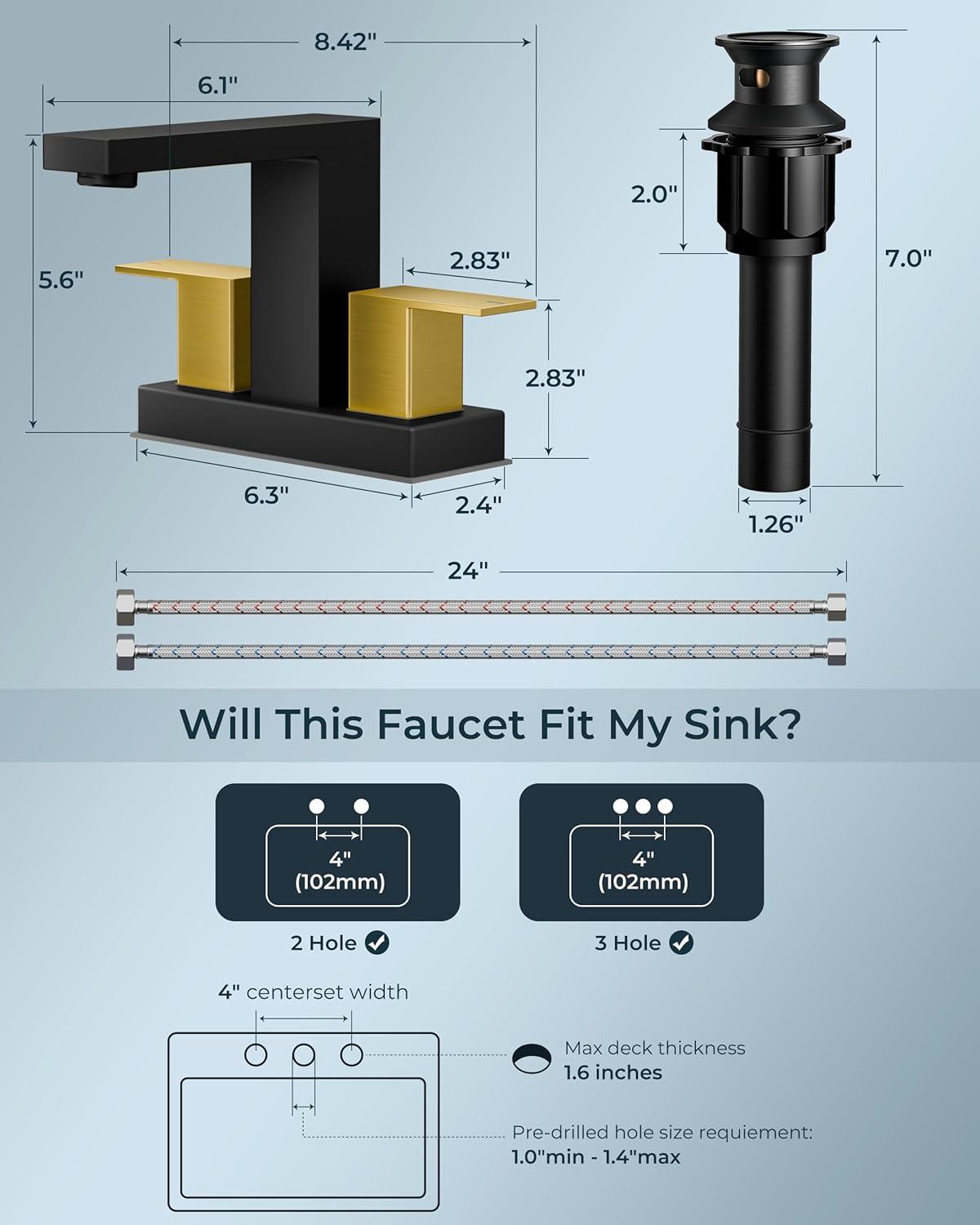 FORIOUS 2 Pack Gold Bathroom Faucet 3 Hole, Square 2 Handle 8 in Widespread Brushed Gold Bathroom Sink Faucet 3 Hole with Metal Drain, 24″ CUPC Supply Lines and Spare Aerator(Black&Stainless Steel)