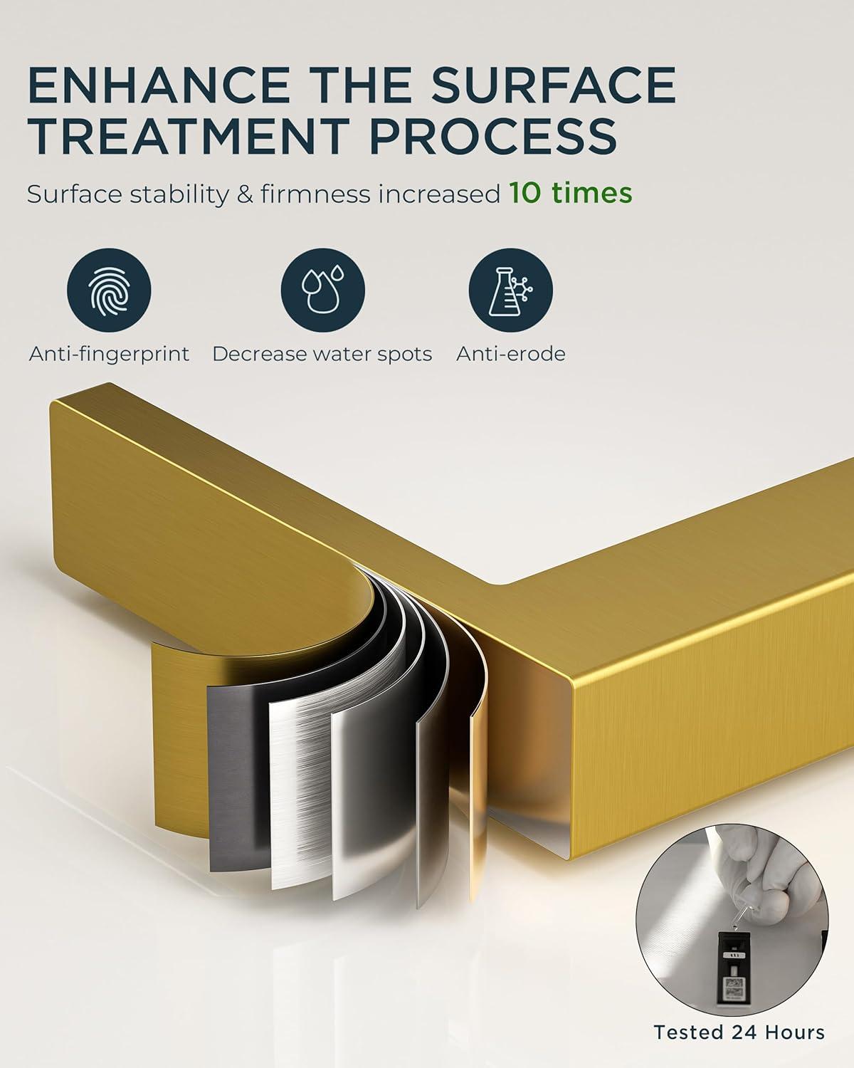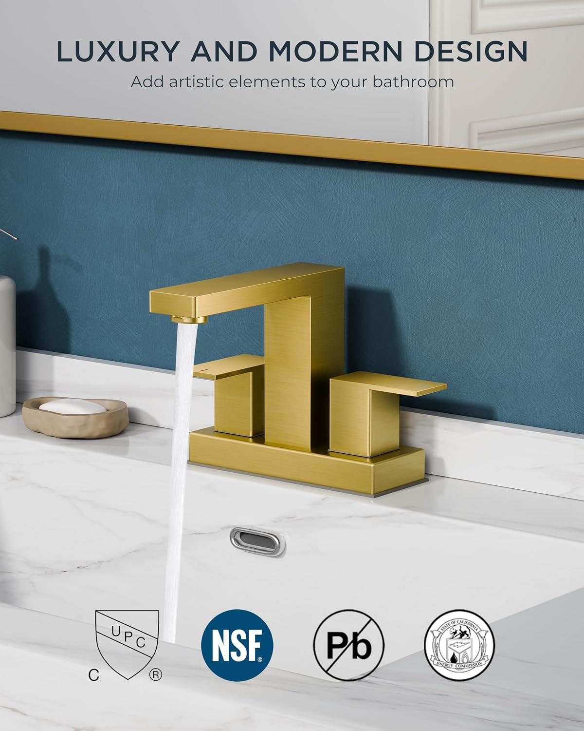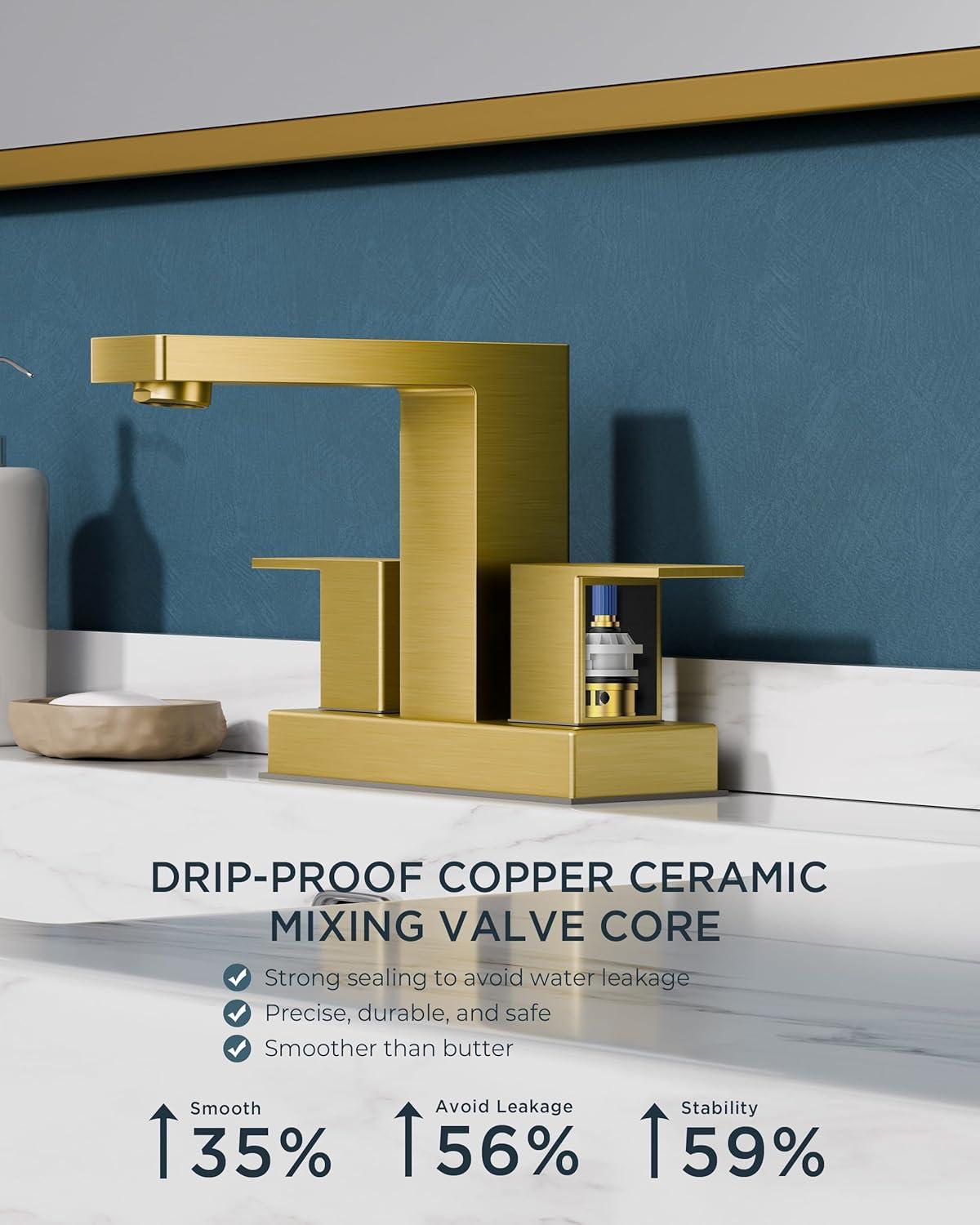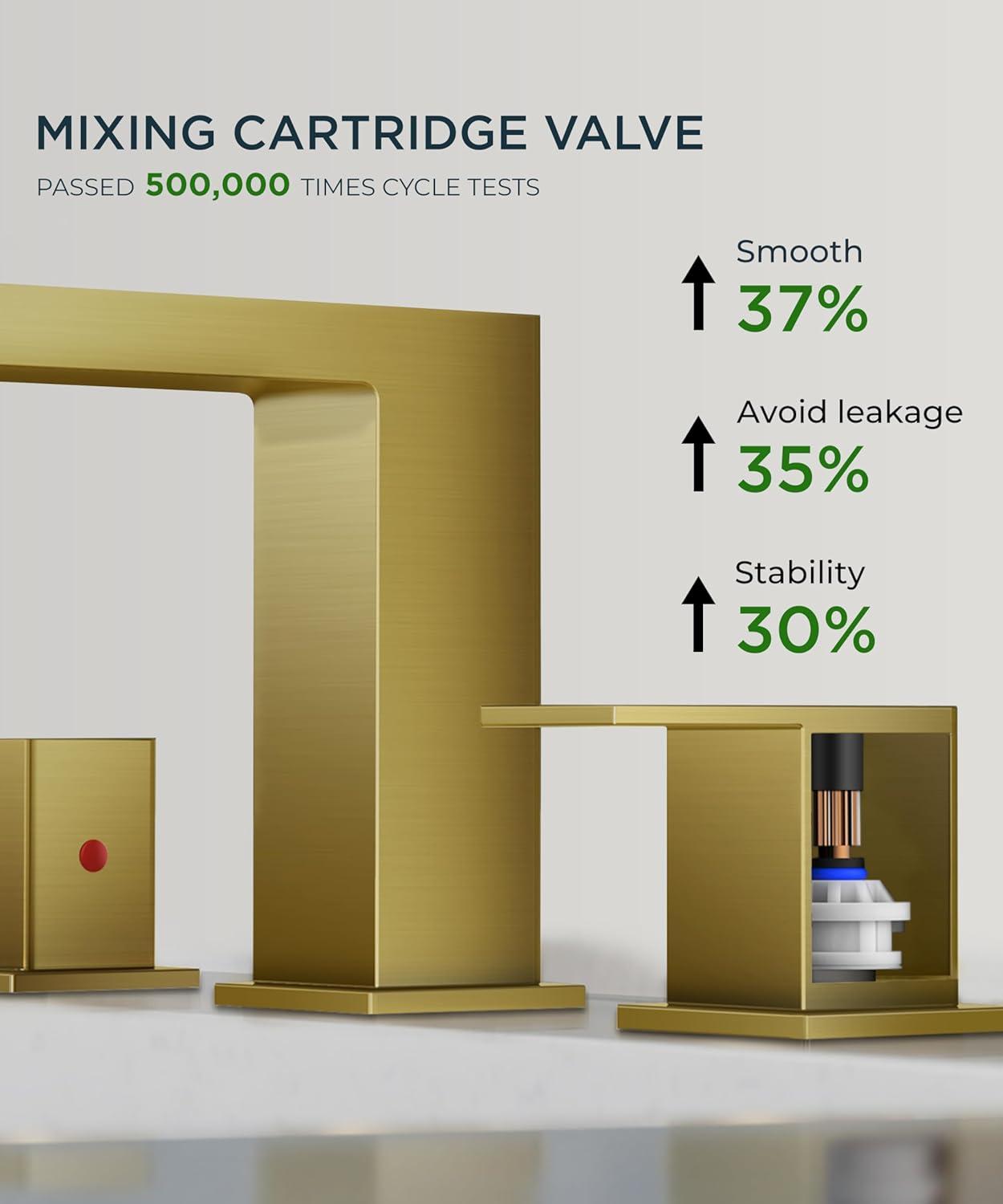 DURABILITY: Mixing ceramic cartridges gold bathroom sink faucet survive 500K+ cycles (Double-enhanced abrasion resistance, 3x performance improvement) with NSF, ANSI 61, cUPC, CEC, WaterSense and DOE certification, for water safety & energy efficiency