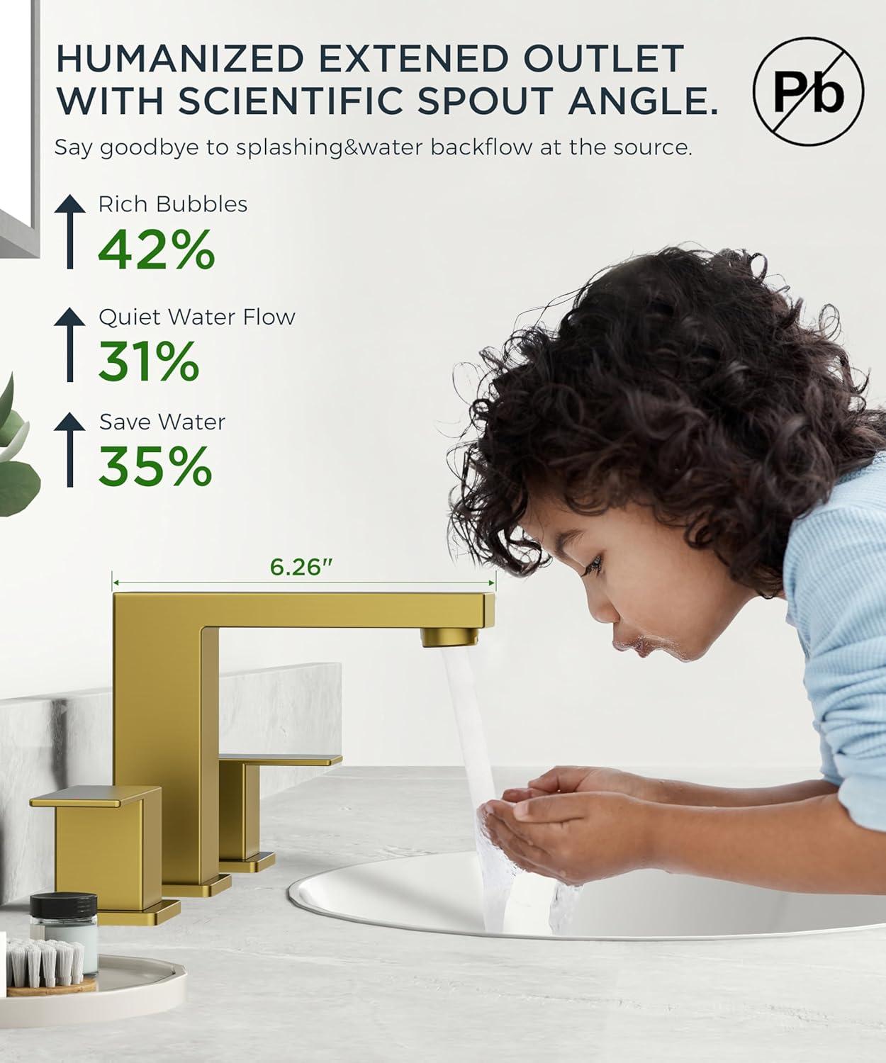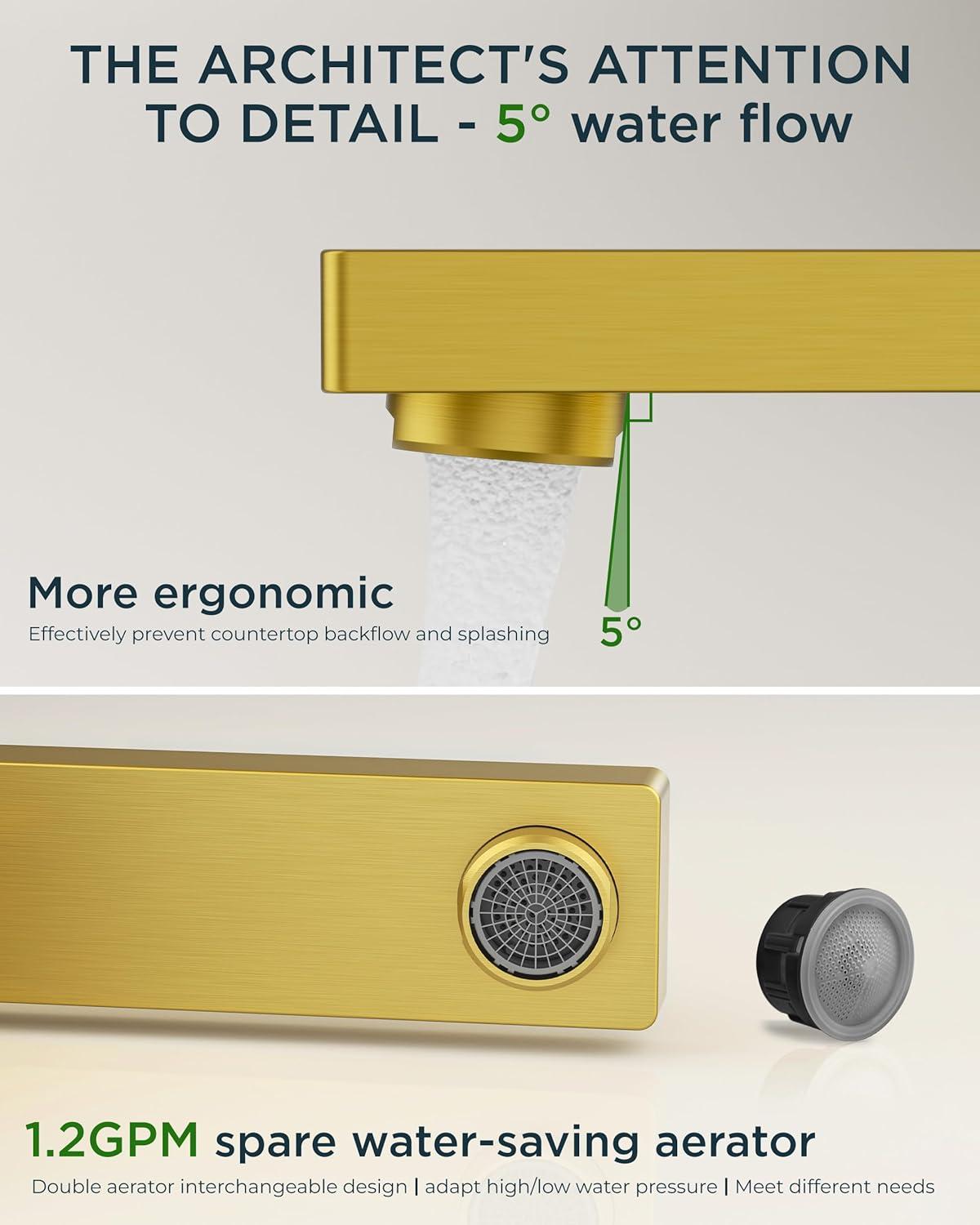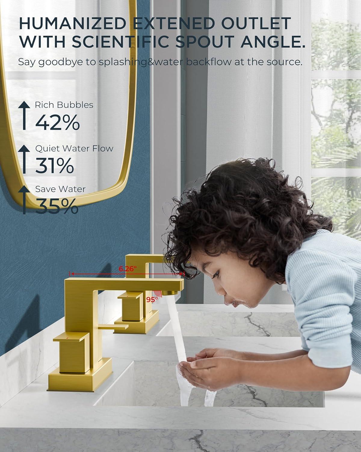 SPLASHGUARD 95° SPOUT: Fluid-dynamics spout with 6.26″ reach eliminates countertop mess. Lab-verified 95° nozzle bathroom gold faucet reduces 49% splashback vs general bathroom faucet – ideal for busy households with kids. Practical&user – friendly