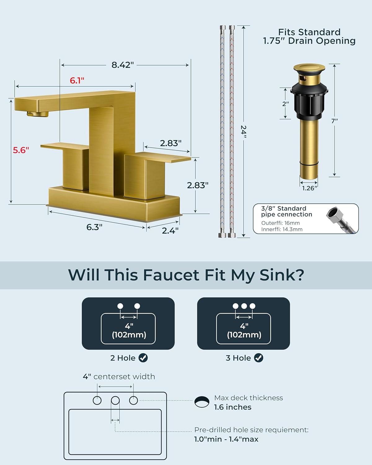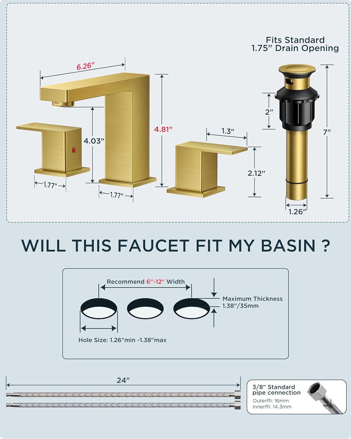 FORIOUS 2 Pack Gold Bathroom Faucet 3 Hole, Square 2 Handle 8 in Widespread Brushed Gold Bathroom Sink Faucet 3 Hole with Metal Drain, 24″ CUPC Supply Lines and Spare Aerator(Black&Stainless Steel)