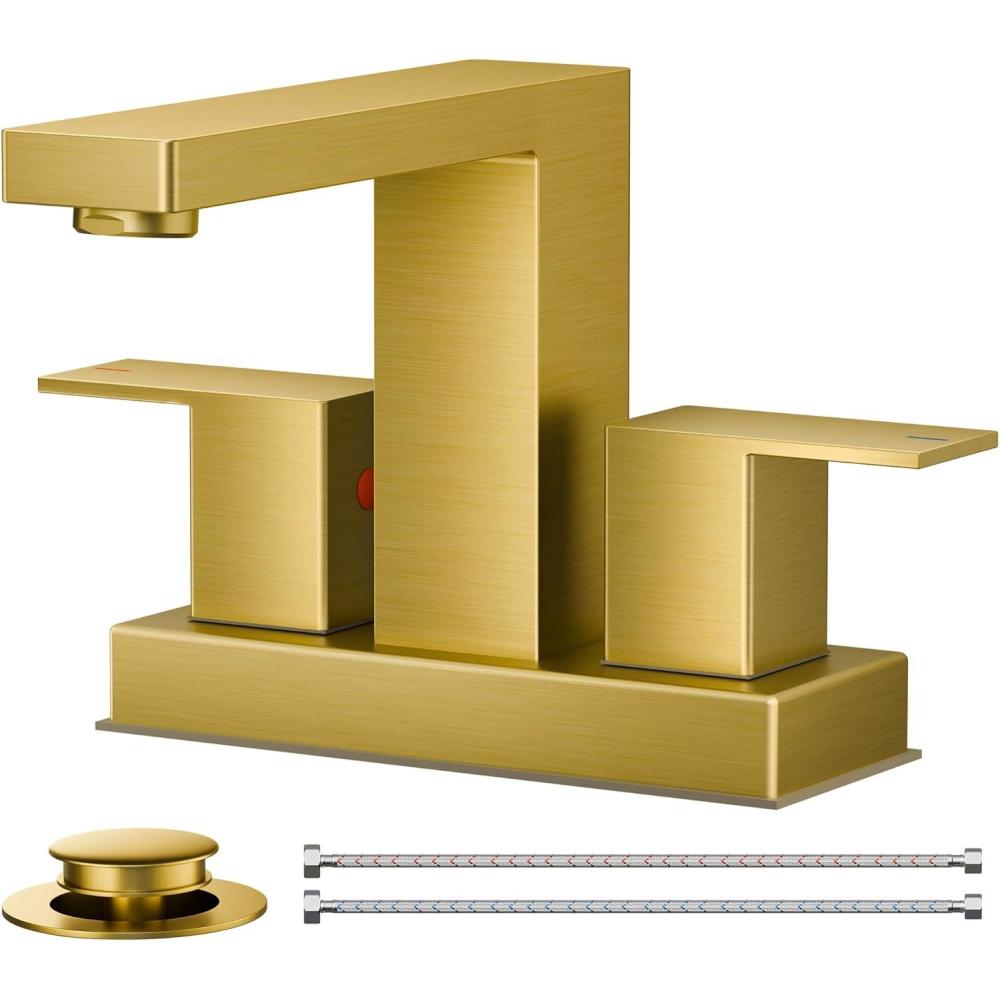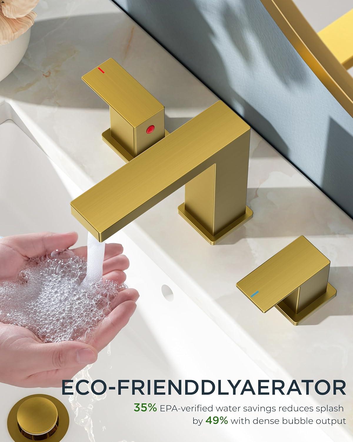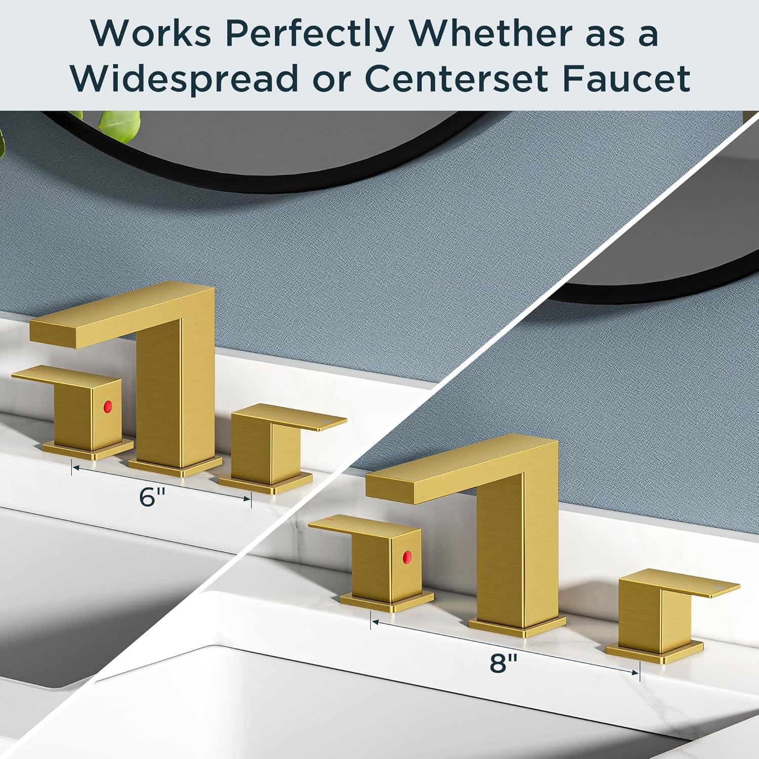 FORIOUS 2 Pack Gold Bathroom Faucet 3 Hole, Square 2 Handle 8 in Widespread Brushed Gold Bathroom Sink Faucet 3 Hole with Metal Drain, 24″ CUPC Supply Lines and Spare Aerator(Brushed Gold)