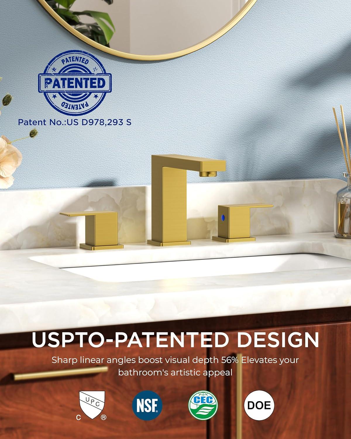 ART DECO TAP: Angular geometry meets Art Deco elegance in muted brushed satin gold faucets for bathroom vanity. USPTO patented square lines deliver 56% deeper visual depth than standard faucets, transforming bathrooms into gallery-inspired spaces