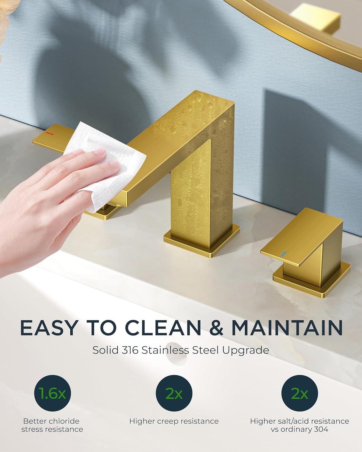 ERGOFLOW CONTROL: Brushed Gold Bathroom Faucet rotates smoothly with minimal torque. Ambidextrous design suits your usage habits and fits most 3-hole sinks (6″-12″ adjustable width). The vanity faucet passes 24hr ASTM test – cleans with a light wipe