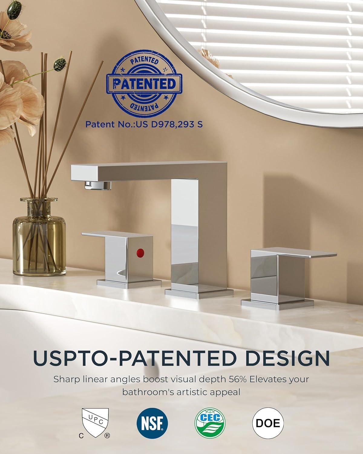 ART DECO TAP: Angular geometry meets Art Deco elegance in muted brushed satin gold faucets for bathroom vanity. USPTO patented square lines deliver 56% deeper visual depth than standard faucets, transforming bathrooms into gallery-inspired spaces