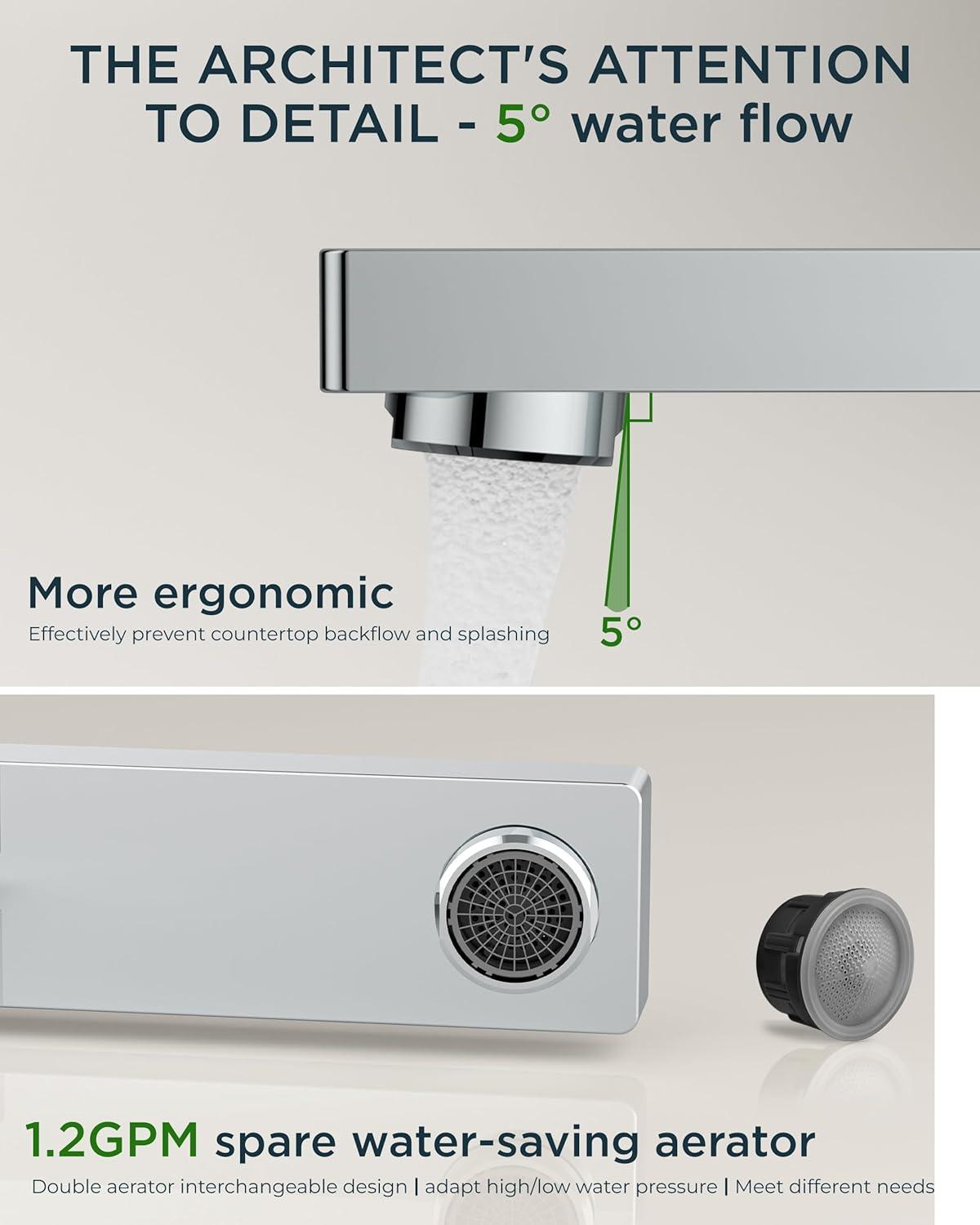 DIY INSTALLATION: 3-click connectors + video guide enable 15-min install. The sink faucet for bathroom with built-in leak-proof gaskets & 1.2GPM aerator save 30% water/38% splash(EPA-certified) — Survey shows 94% users install without plumbers. Flow rate: 1.2gpm/4.5L/min at Max 60psi