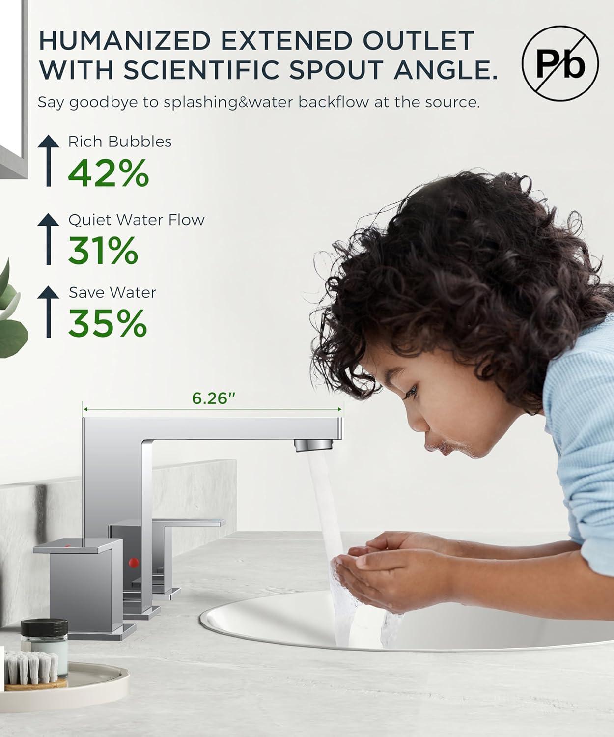SPLASHGUARD 95° SPOUT: Fluid-dynamics spout with 6.26″ reach eliminates countertop mess. Lab-verified 95° nozzle bathroom gold faucet reduces 49% splashback vs general bathroom faucet – ideal for busy households with kids. Practical&user – friendly