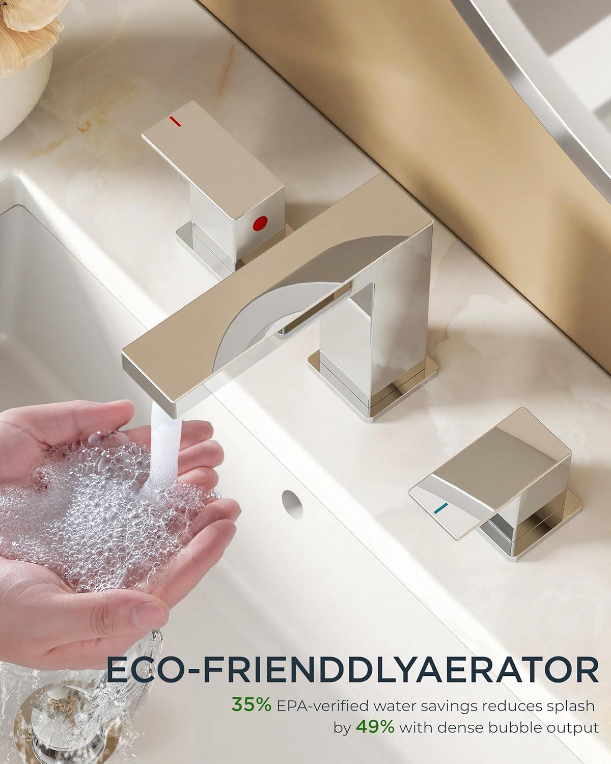 FORIOUS 2 Pack Gold Bathroom Faucet 3 Hole, Square 2 Handle 8 in Widespread Brushed Gold Bathroom Sink Faucet 3 Hole with Metal Drain, 24″ CUPC Supply Lines and Spare Aerator(Chrome)