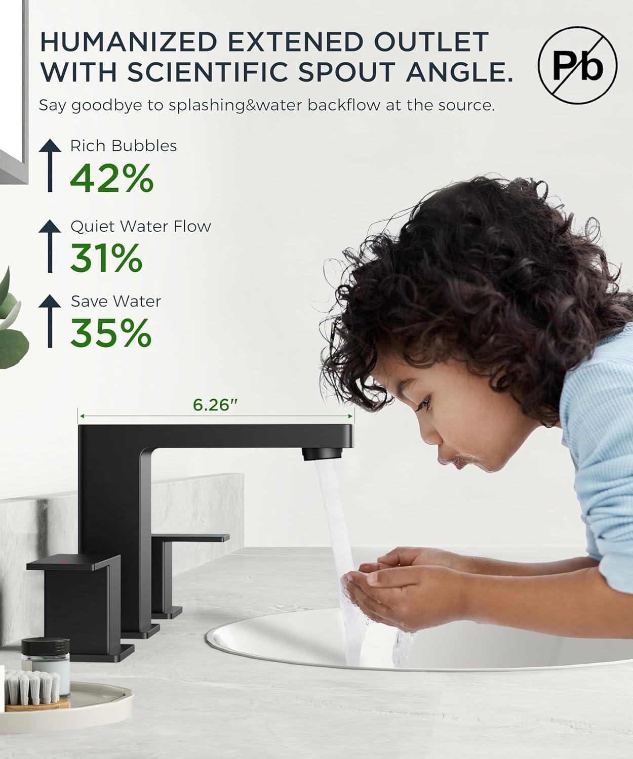 SPLASHGUARD 95° SPOUT: Fluid-dynamics spout with 6.26″ reach eliminates countertop mess. Lab-verified 95° nozzle bathroom gold faucet reduces 49% splashback vs general bathroom faucet – ideal for busy households with kids. Practical&user – friendly
