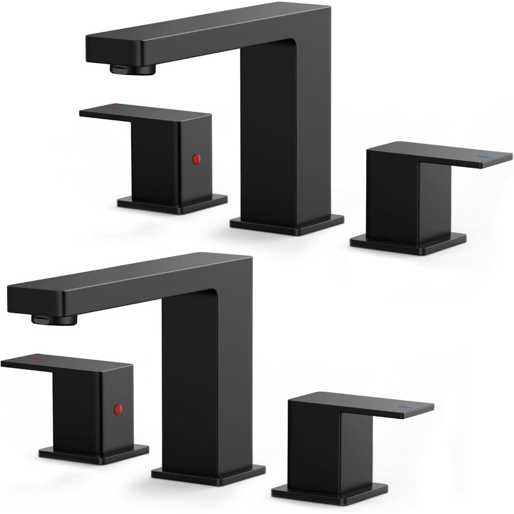imageFORIOUS 2 Pack Gold Bathroom Faucet 3 Hole Square 2 Handle 8 in Widespread Brushed Gold Bathroom Sink Faucet 3 Hole with Metal Drain 24 CUPC Supply Lines and Spare AeratorMatte Black  2