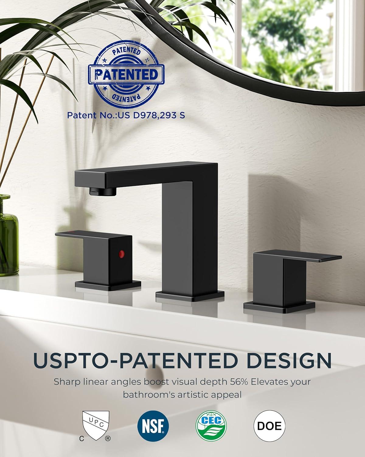 ART DECO TAP: Angular geometry meets Art Deco elegance in muted brushed satin gold faucets for bathroom vanity. USPTO patented square lines deliver 56% deeper visual depth than standard faucets, transforming bathrooms into gallery-inspired spaces