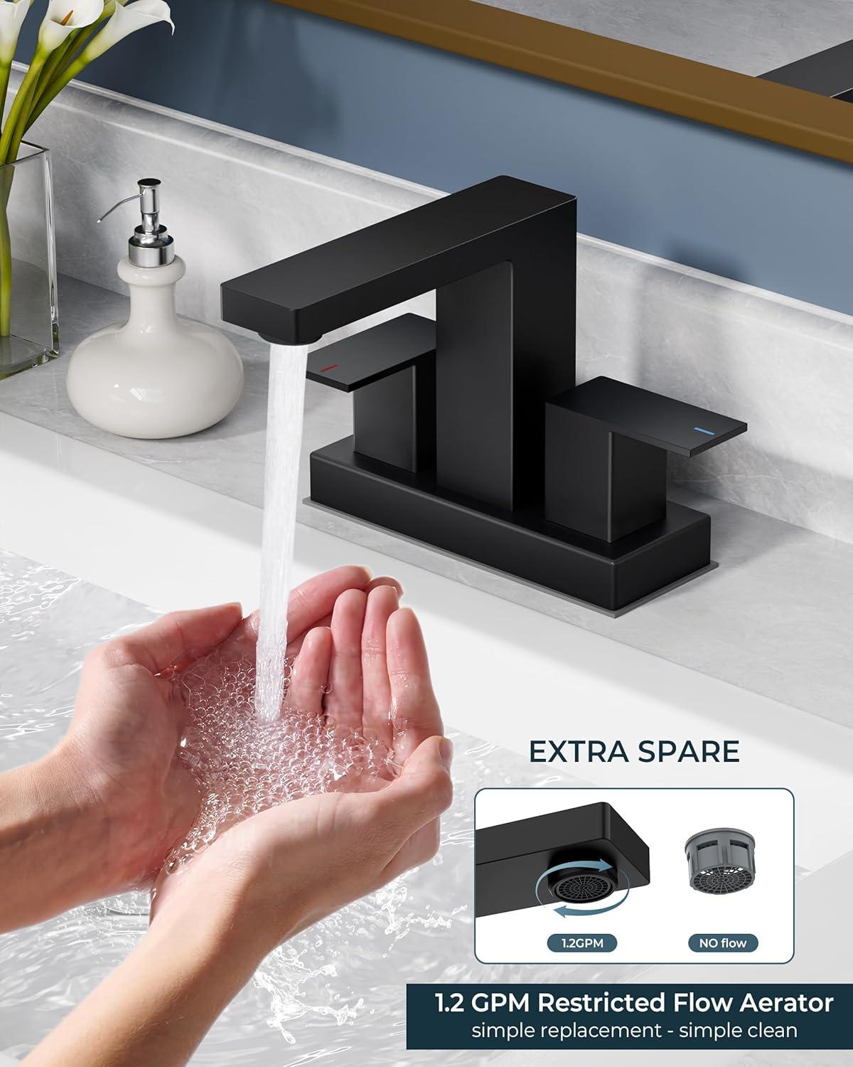 DIY INSTALLATION: 3-click connectors + video guide enable 15-min install. The sink faucet for bathroom with built-in leak-proof gaskets & 1.2GPM aerator save 30% water/38% splash(EPA-certified) — Survey shows 94% users install without plumbers. Flow rate: 1.2gpm/4.5L/min at Max 60psi