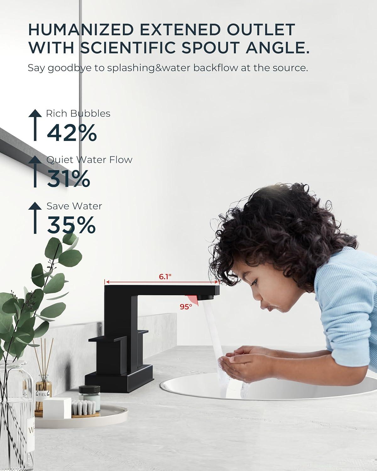 SPLASHGUARD 95° SPOUT: Fluid-dynamics spout with 6.26″ reach eliminates countertop mess. Lab-verified 95° nozzle bathroom gold faucet reduces 49% splashback vs general bathroom faucet – ideal for busy households with kids. Practical&user – friendly