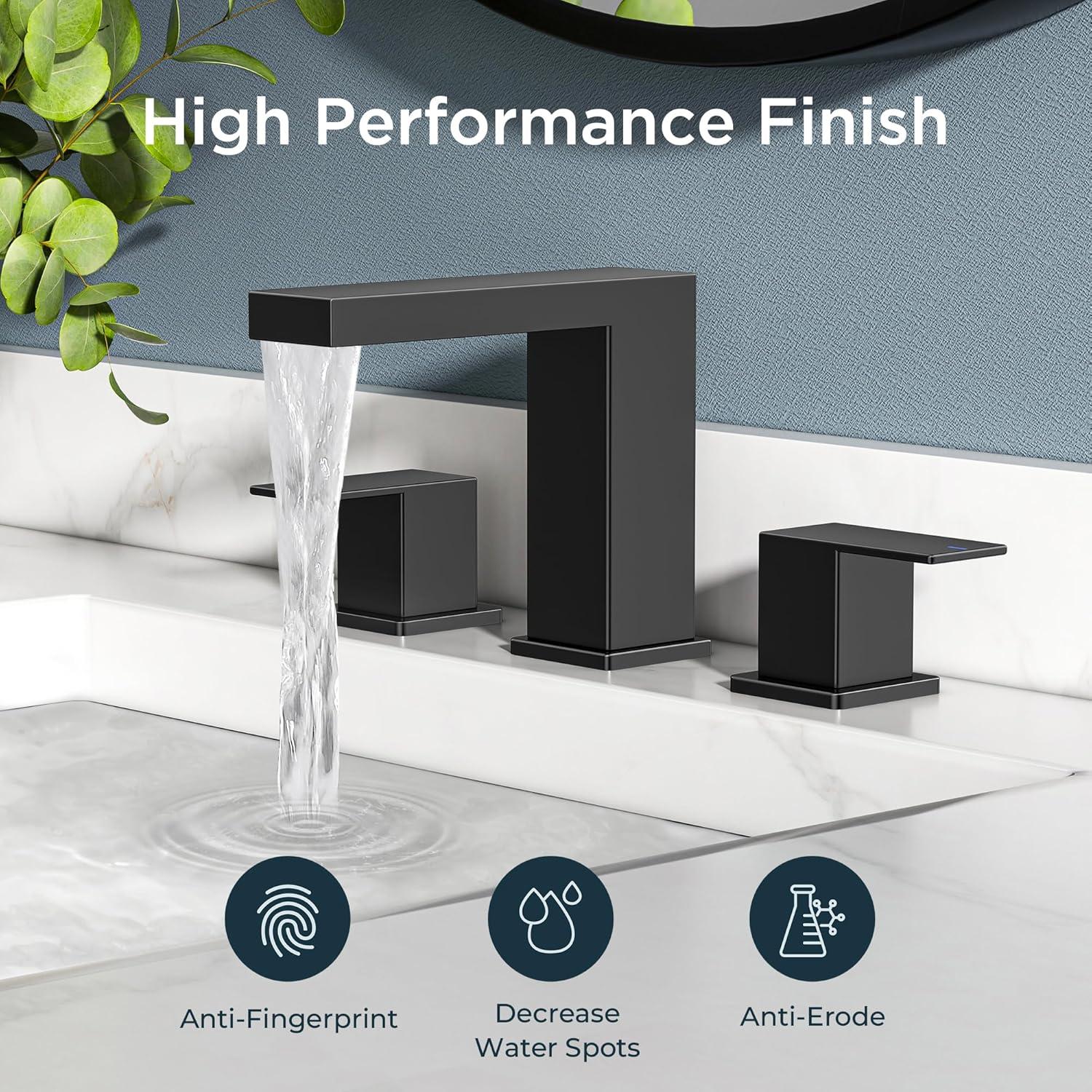 imageFORIOUS 2 Pack Gold Bathroom Faucet 3 Hole Square 2 Handle 8 in Widespread Brushed Gold Bathroom Sink Faucet 3 Hole with Metal Drain 24 CUPC Supply Lines and Spare AeratorMatte Black  2