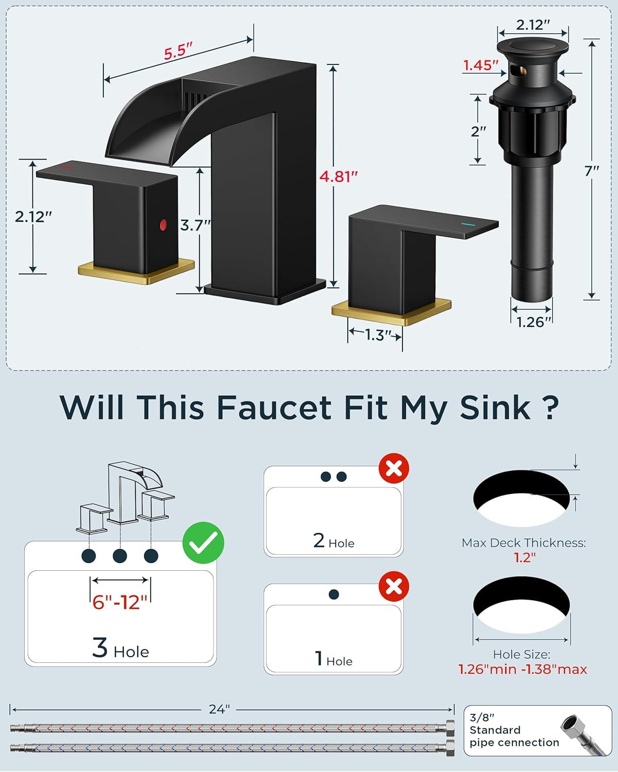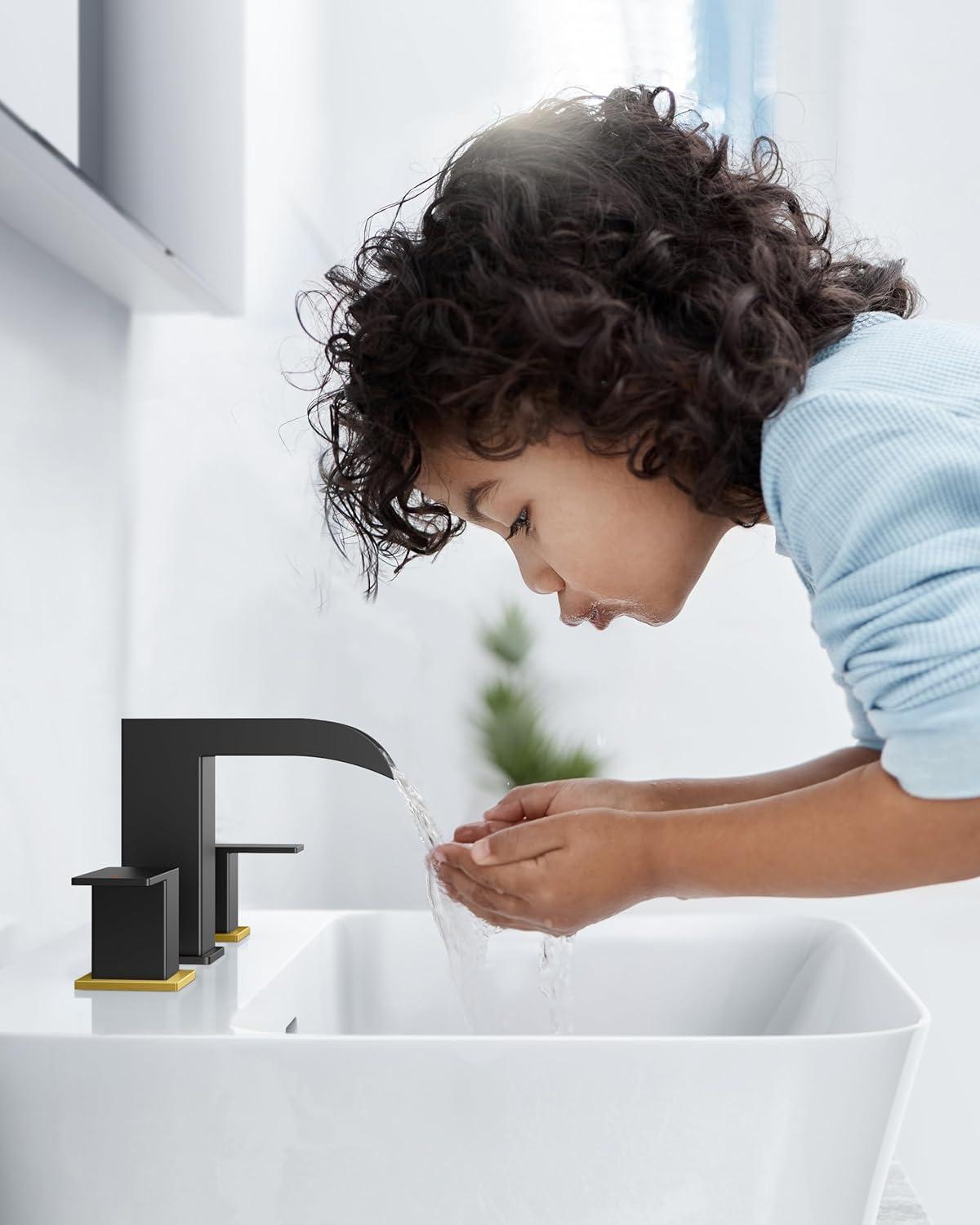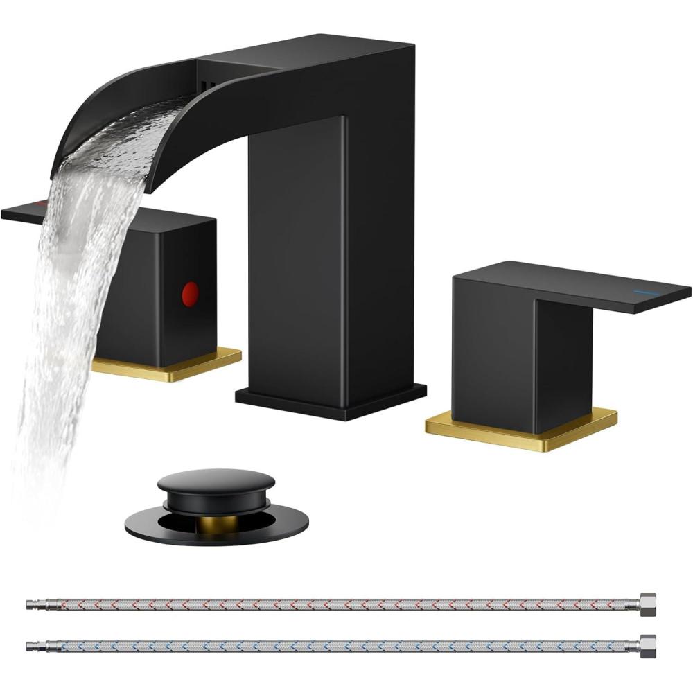 FORIOUS 2 Pack, Square Brushed Gold Bathroom Faucets 3 Hole, Waterfall 8 Inch Widespread Bathroom Sink Faucet with Metal Pop-up Drain and Supply Lines, Two Handles for Vanity, Lavatory, Restroom(Black and Gold)