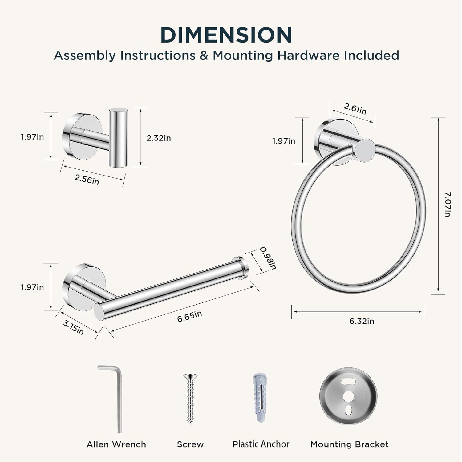 Package Include: The bathroom hardware set includes: 1* towel ring, 1* toilet paper holder and 2* robe hooks. Perfect for various settings including bedrooms, kitchens, laundry rooms, and patios