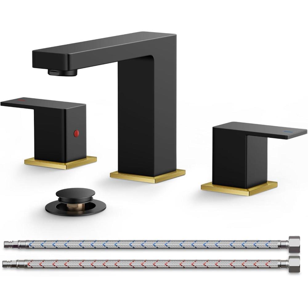 FORIOUS 8 Inch Widespread Black and Gold Bathroom Faucet Square, 2 Handle 6 Inch Matte Black Faucets for Bathroom Sink 3 Hole 8-10 Inch Vanity Sink, with Pop-up Drain, Hot and Cold Water Hoses(Black&Stainless Steel)