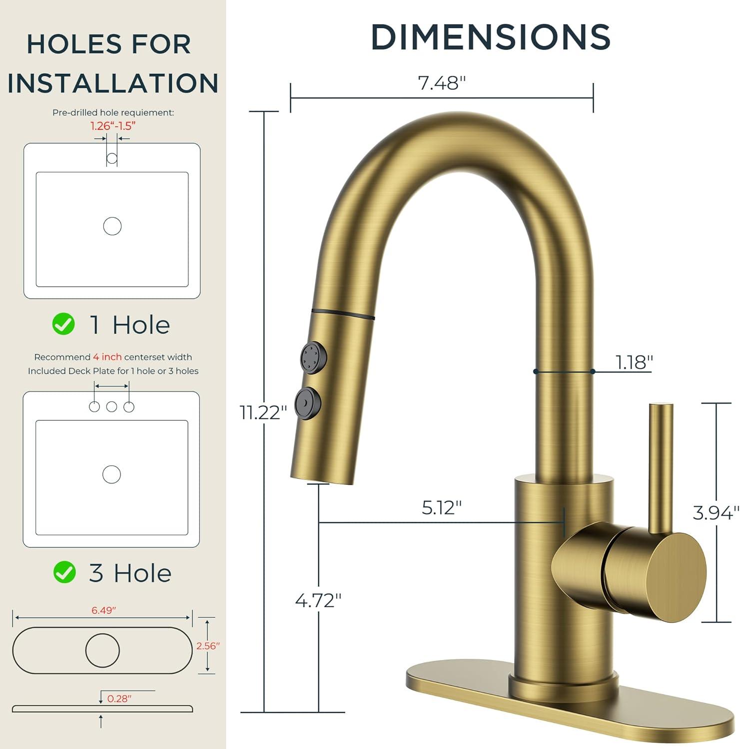 imageFORIOUS Bathroom Faucet 1 Hole with Pull Down Sprayer 3 Hole Brushed Nickel Bathroom Sink Faucet with Pop Up Drain for RV Bar Laundry Vanity Utility Sink Remodel Single Handle DesignBrushed Gold