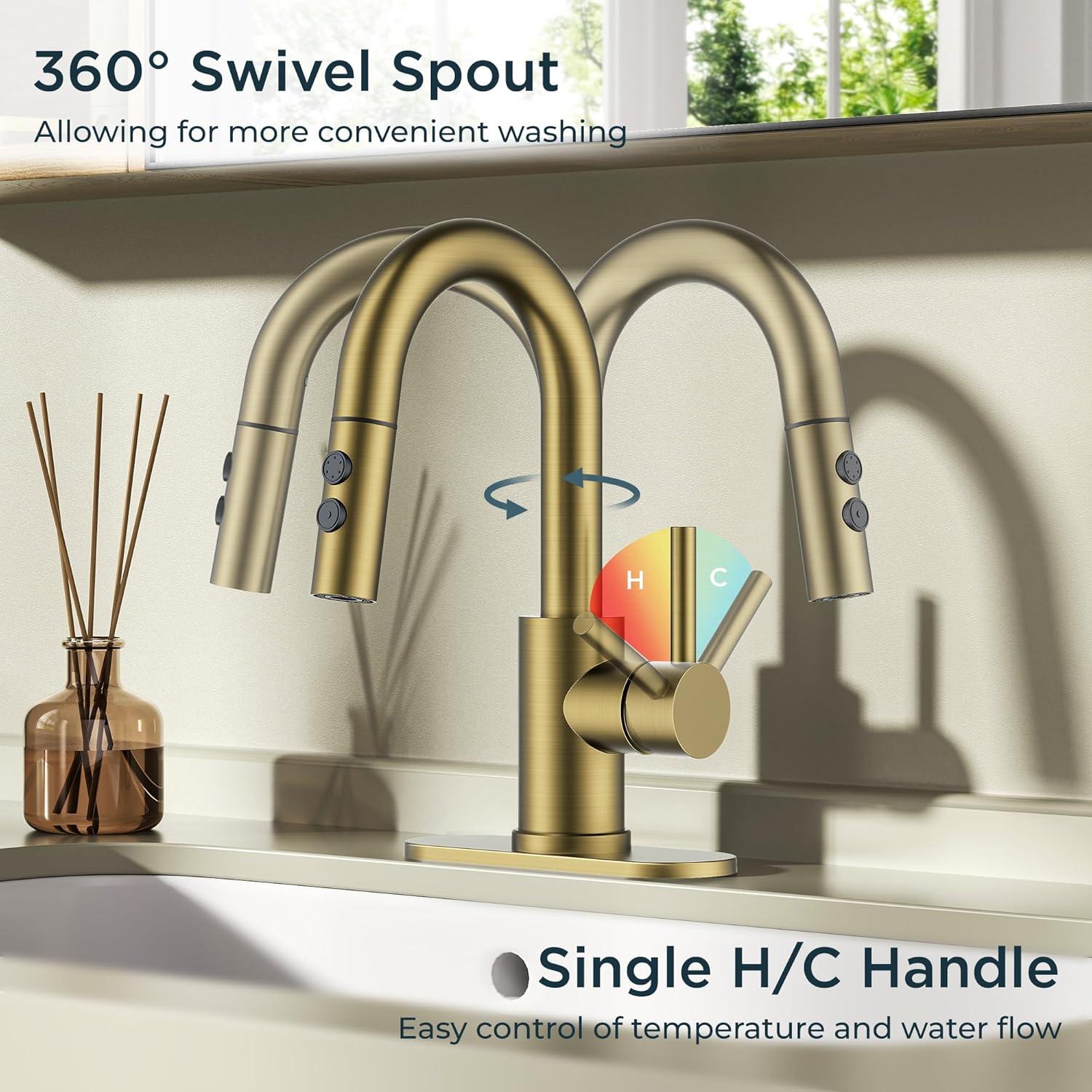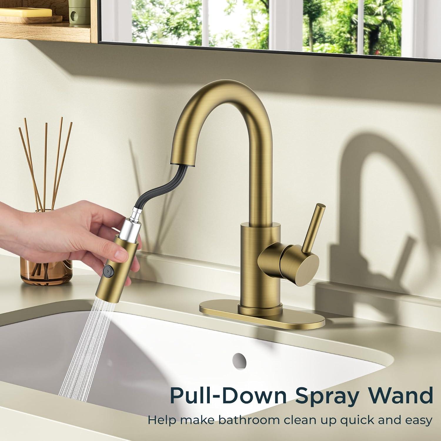 FORIOUS Bathroom Faucet 1 Hole with Pull Down Sprayer, 3 Hole Brushed Nickel Bathroom Sink Faucet with Pop Up Drain for RV Bar Laundry Vanity Utility Sink Remodel, Single Handle Design(Brushed Gold)