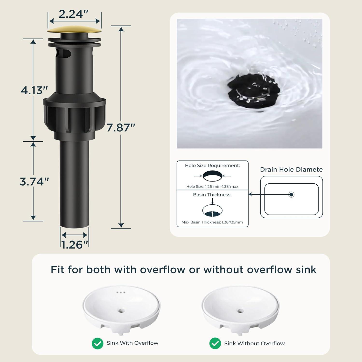 Pop-Up Drain Included:Forious bathroom faucets offered a pop up drain can prevent debris, hair,trinket cloged the drain.Recommend for sink with overflow sink, but for withtout overflow sink, only for hole thickness range of 0.76 -1.15 inches