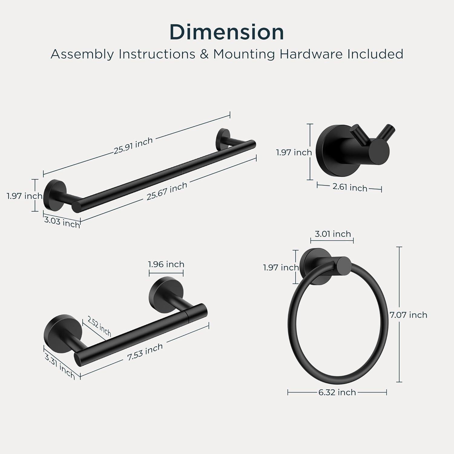 4 Pieces Bathroom Accessories Set: This bathroom towel holder set includes 24 inch towel bar, towel ring, toilet paper holder, and towel hooks – offers practical storage solutions
