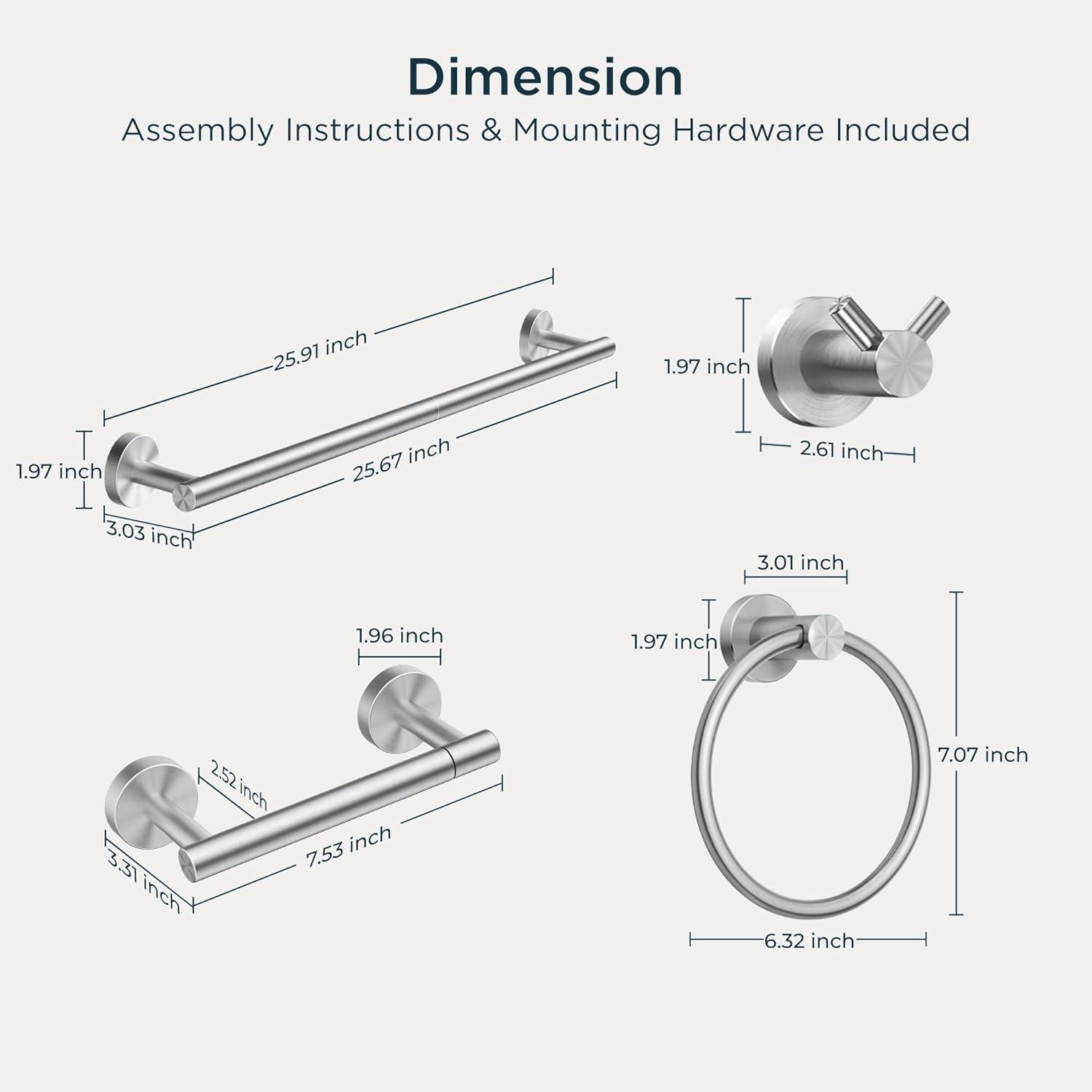 4 Pieces Bathroom Accessories Set: This bathroom towel holder set includes 24 inch towel bar, towel ring, toilet paper holder, and towel hooks – offers practical storage solutions