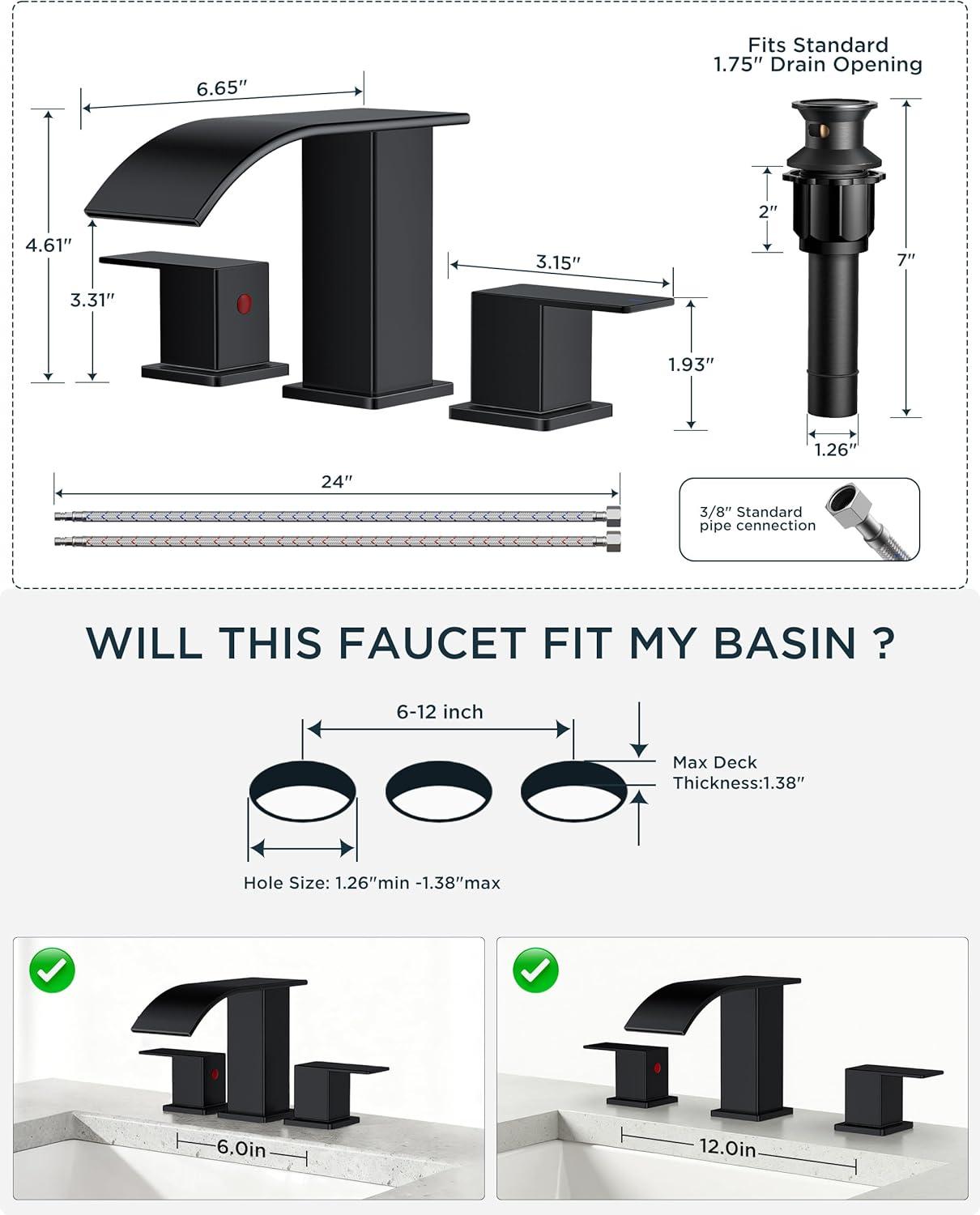 imageFORIOUS Black and Gold Bathroom Faucets 3 Hole Two Handle 8 Inch Widespread Lavatory Vanity Bathroom Sink Faucet with CUPC Hose and Metal Popup Drain Waterfall SpoutMatte Black