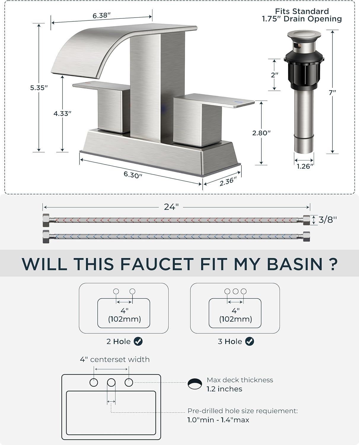 FORIOUS Black and Gold Bathroom Faucets 3 Hole, Two Handle 8 Inch Widespread Lavatory Vanity Bathroom Sink Faucet with CUPC Hose and Metal Pop-up Drain, Waterfall Spout(Stainless Steel)