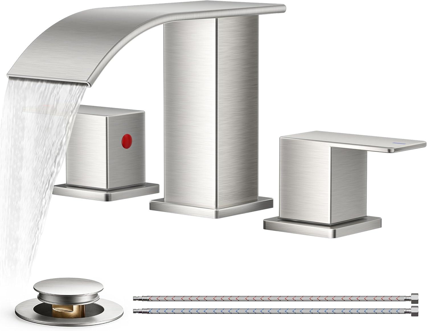 FORIOUS Square Matte Black Bathroom Faucets 3 Hole, Waterfall 8 Inch Widespread Bathroom Sink Faucet with Metal Pop-up Drain and Supply Lines, Two Handles for Vanity, RV, Farmhouse(Black and Brushed Nickel)