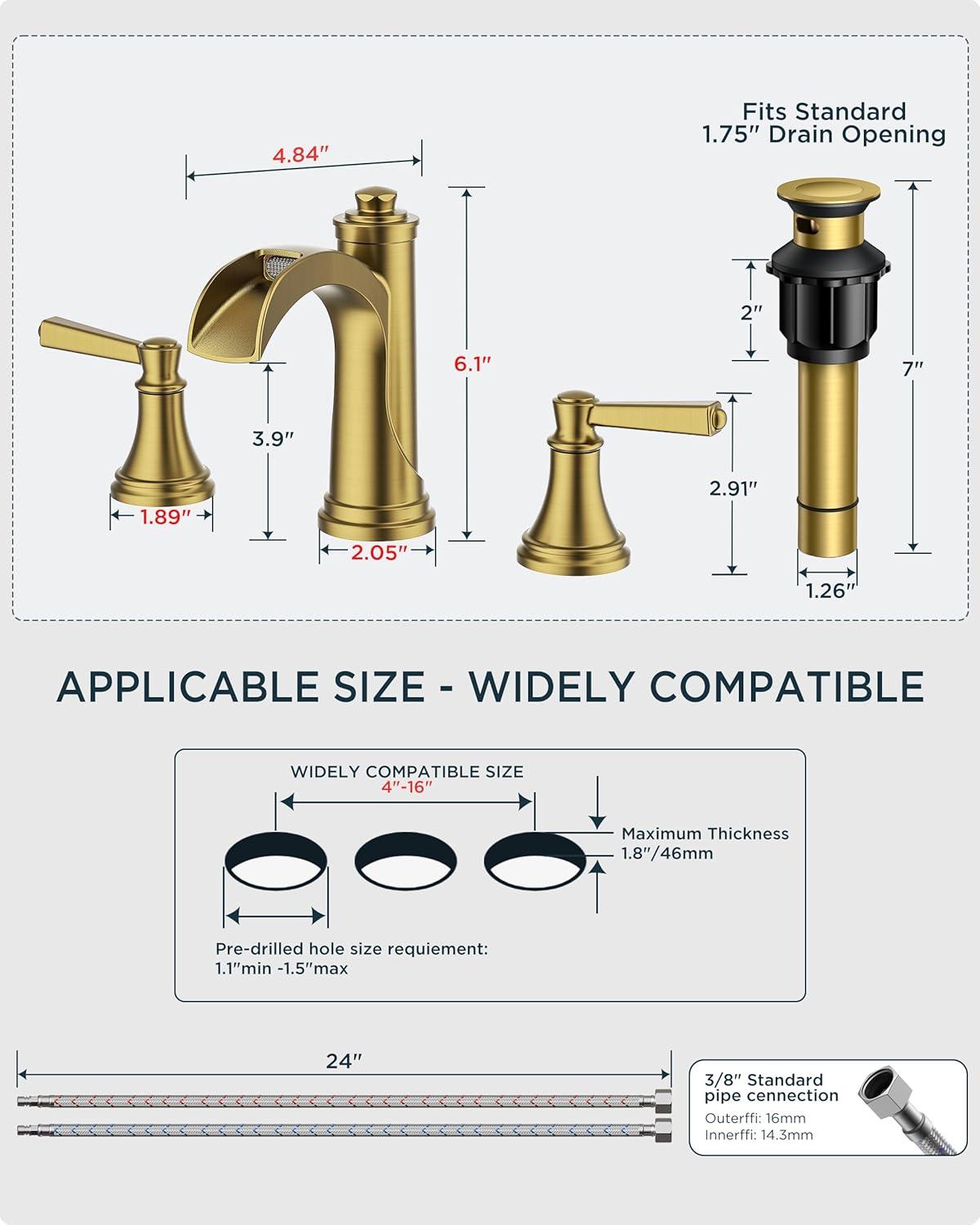 Truly All-Inclusive: The 8 inch bathroom faucet comes with a premium all-metal pop-up drain kit, suitable for 1.6-1.9″ drain holes and 1.2-2.4″ thickness drain holes. If your sink does not have an overflow, please pay attention to the hole thickness