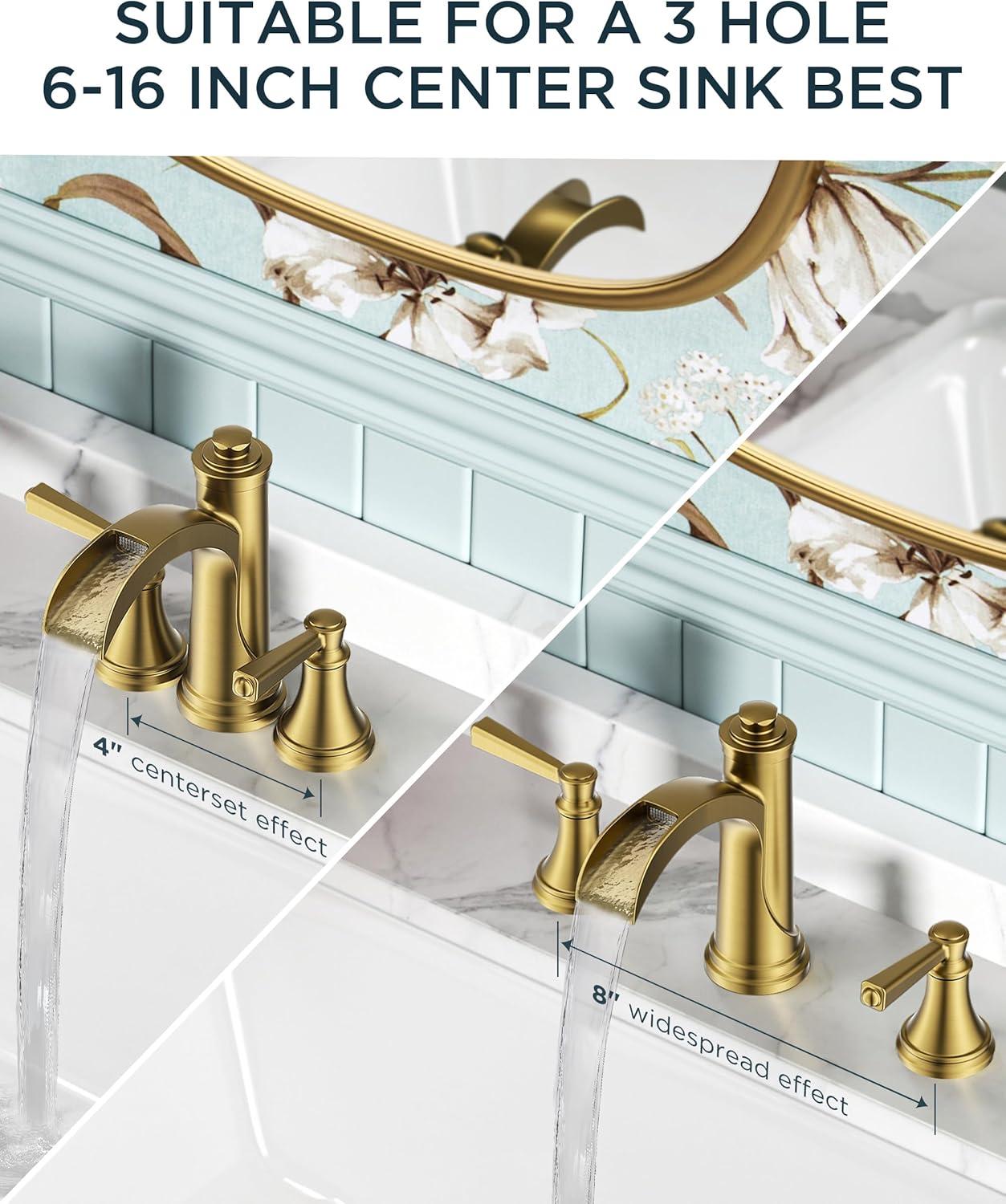 imageFORIOUS Black Bathroom Faucet 3 Hole 2 Handle Brass 8 Inch Widespread Matte Black Bathroom Sink Faucet Waterfall with Popup Drain and CUPC Flexible Hoses Vanity Tap 3 HolesBrushed Gold
