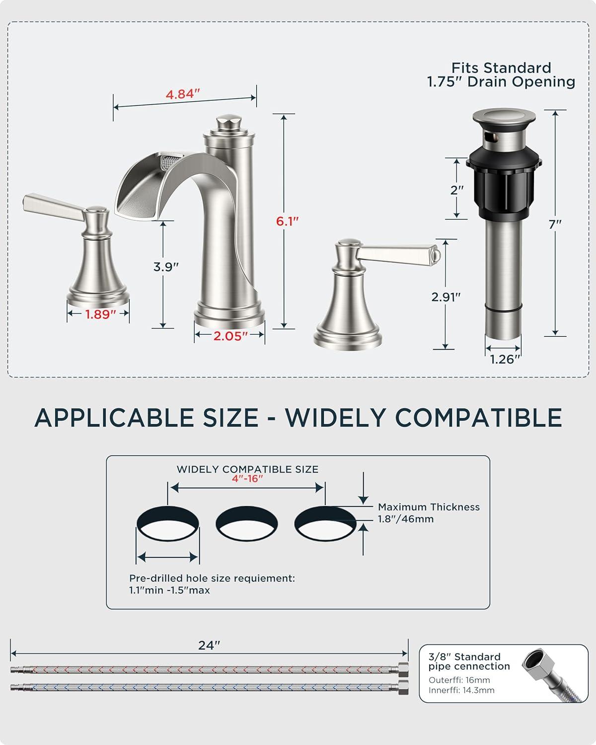 Truly All-Inclusive: The 8 inch bathroom faucet comes with a premium all-metal pop-up drain kit, suitable for 1.6-1.9″ drain holes and 1.2-2.4″ thickness drain holes. If your sink does not have an overflow, please pay attention to the hole thickness
