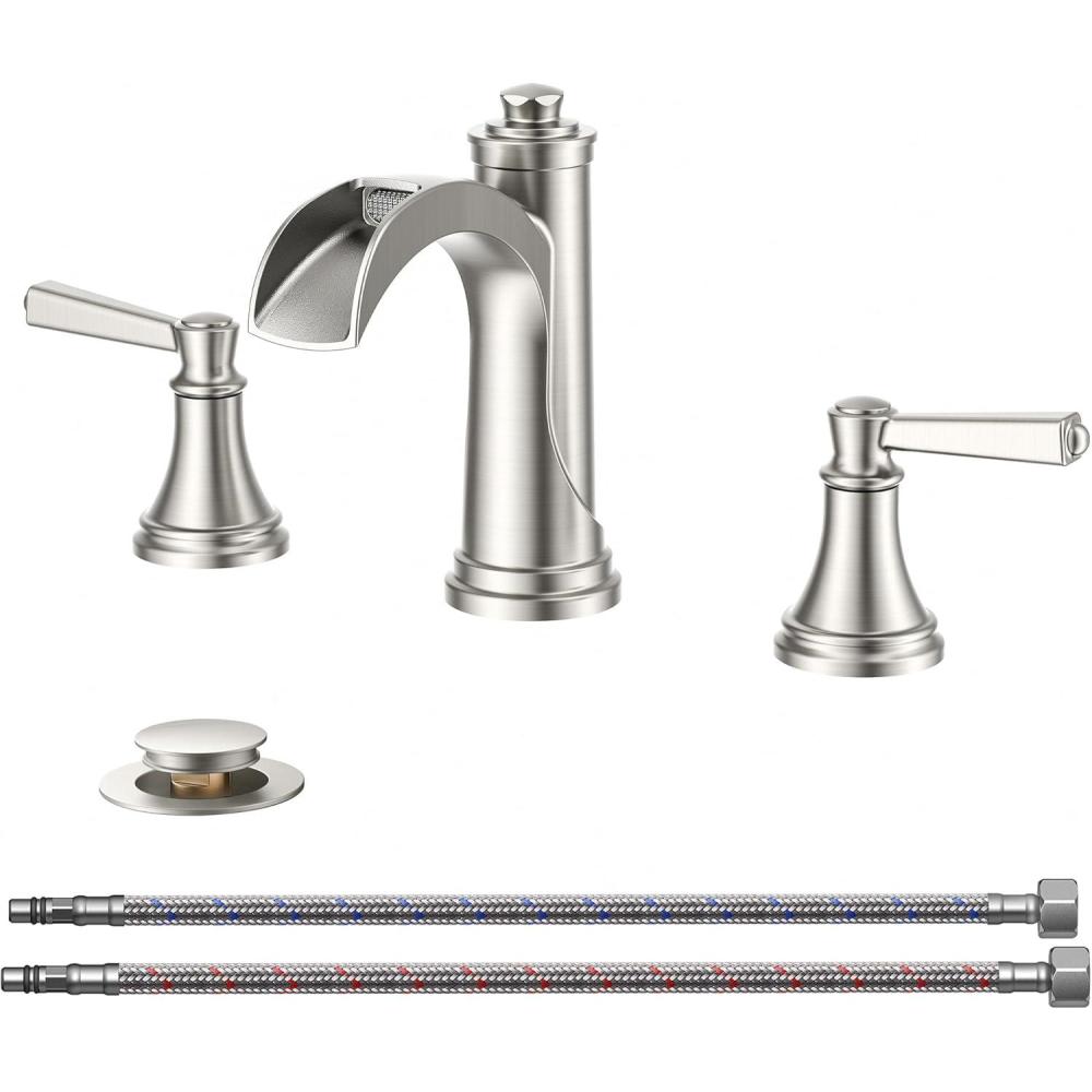 imageFORIOUS Black Bathroom Faucet 3 Hole 2 Handle Brass 8 Inch Widespread Matte Black Bathroom Sink Faucet Waterfall with Popup Drain and CUPC Flexible Hoses Vanity Tap 3 HolesBrushed Silver