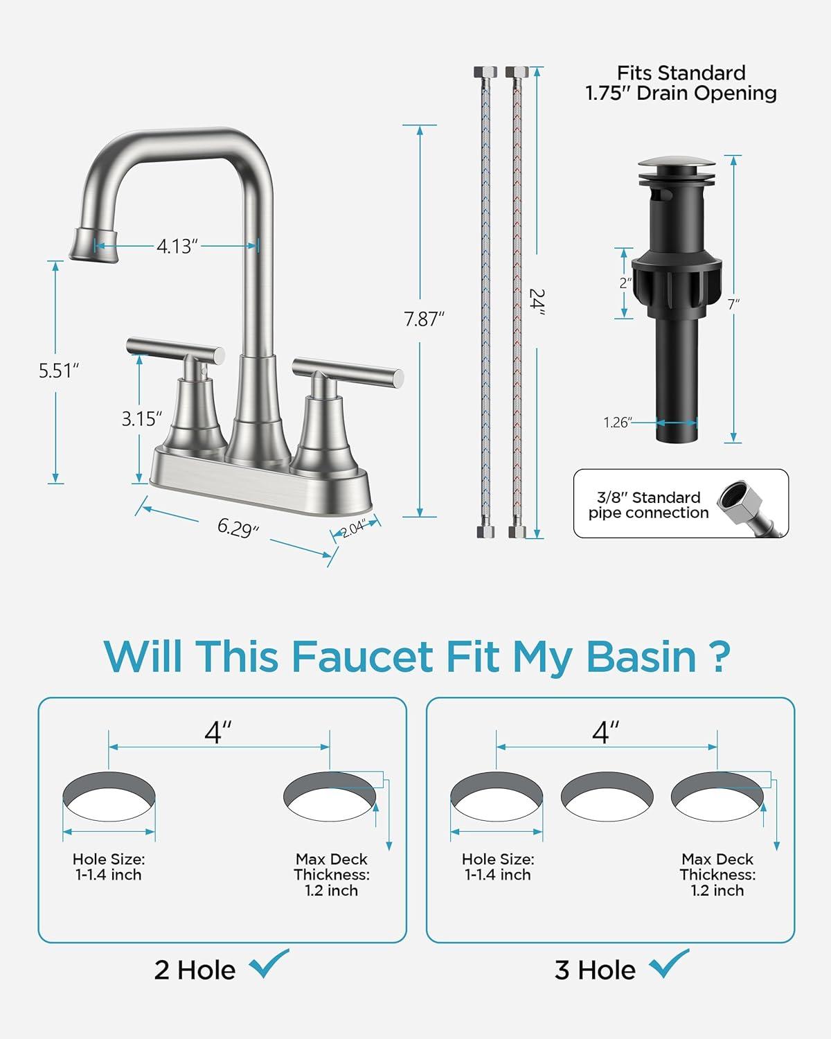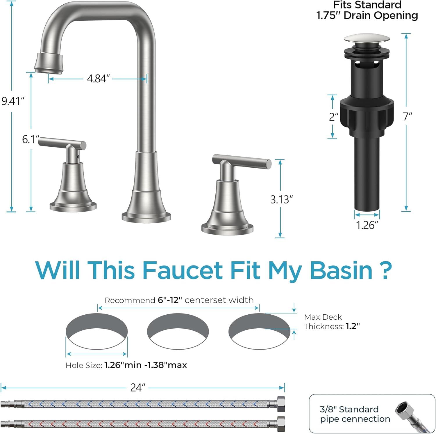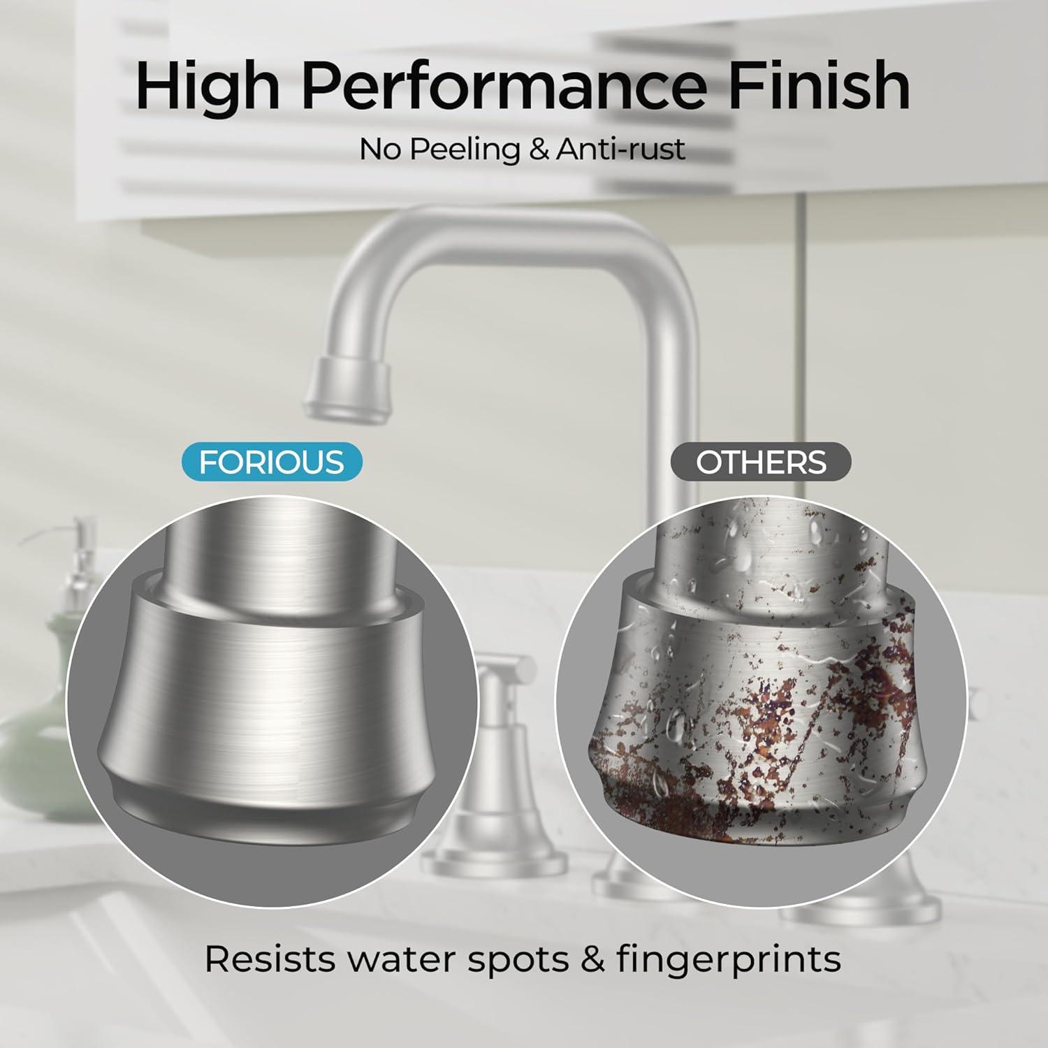 INSTALLATION IN MINUTES: FORIOUS bathroom sink faucet fits 8-12 inch 3-hole setups. 3 hole bathroom faucets install in 15 minutes with pre-assembled handles and a fast connect system. Includes quick connect hose,pop-up drain, and 24 inch water supply hoses.
