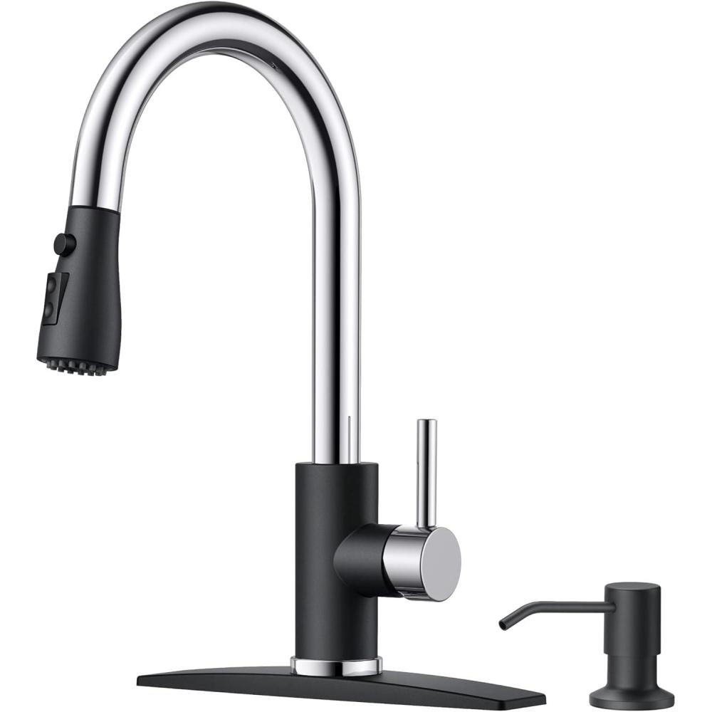 FORIOUS Black Kitchen Faucet with Soap Dispenser and Pull Down Sprayer, Bar High Arc Single Handle Classic 3 Modes Stainless Steel Faucet for Kitchen Sink Farmhouse RV Laundry Camper(Black&Chrome)