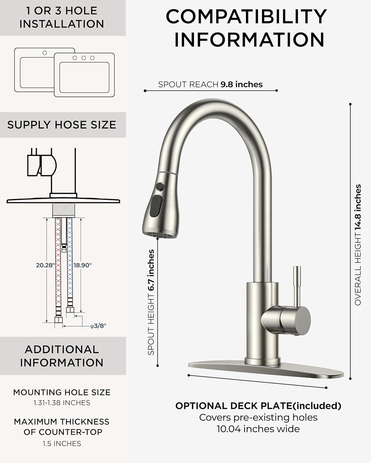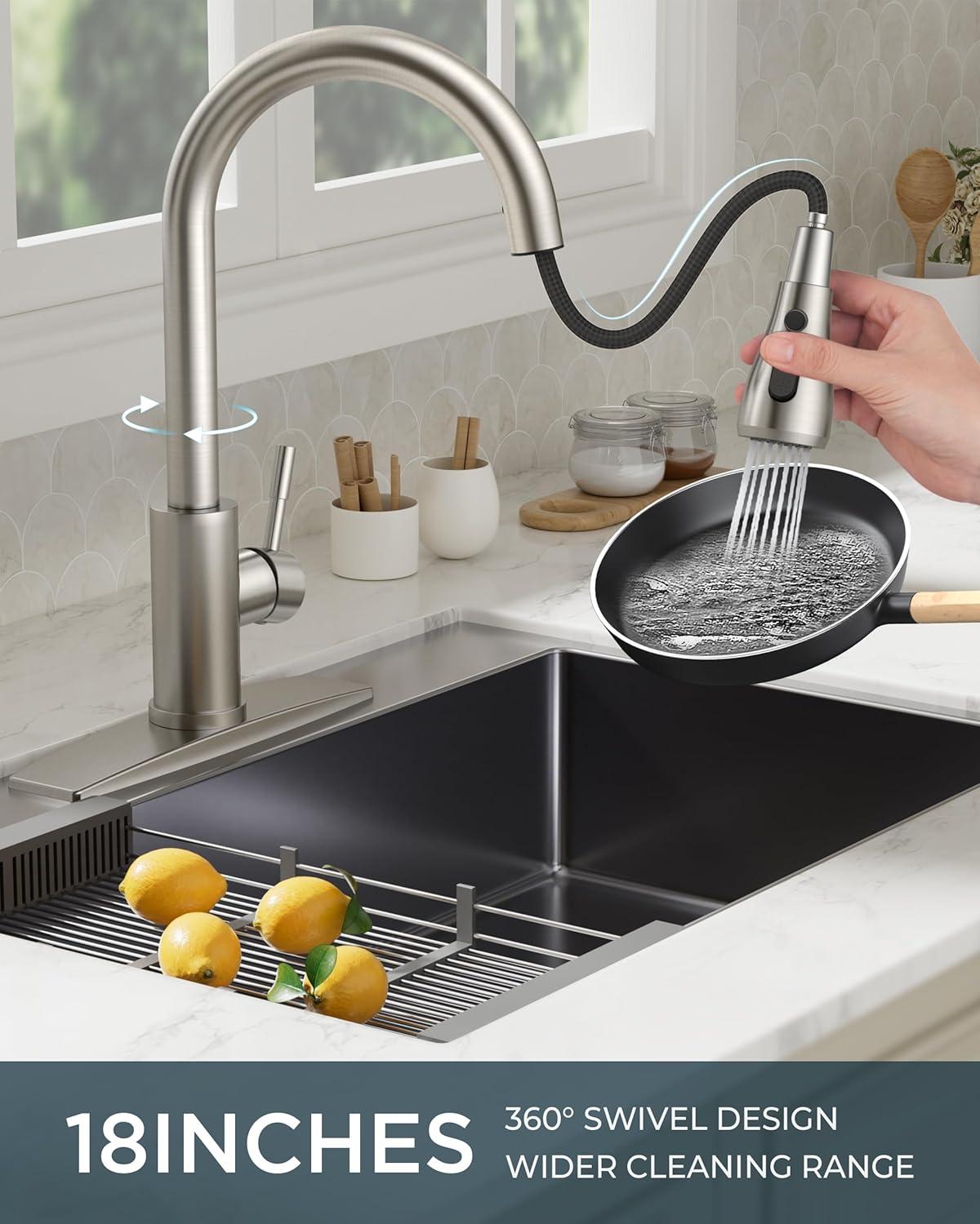 Multi-Functional Kitchen Faucet — The FORIOUS high arc kitchen faucet with pull-down sprayer has 3 spray modes – Stream, Spray and Pause modes —for versatile use. It includes a 360° rotating head and an 18-inch retractable hose for complete sink coverage