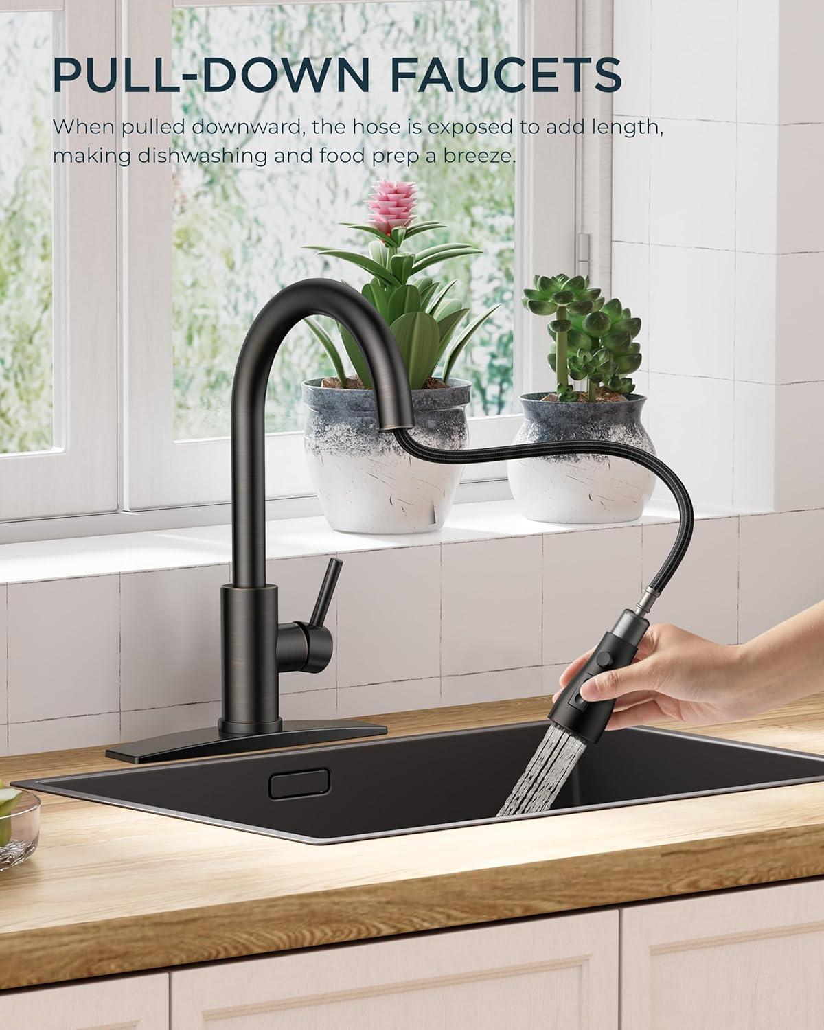 Multi-Functional Kitchen Faucet — The FORIOUS high arc kitchen faucet with pull-down sprayer has 3 spray modes – Stream, Spray and Pause modes —for versatile use. It includes a 360° rotating head and an 18-inch retractable hose for complete sink coverage