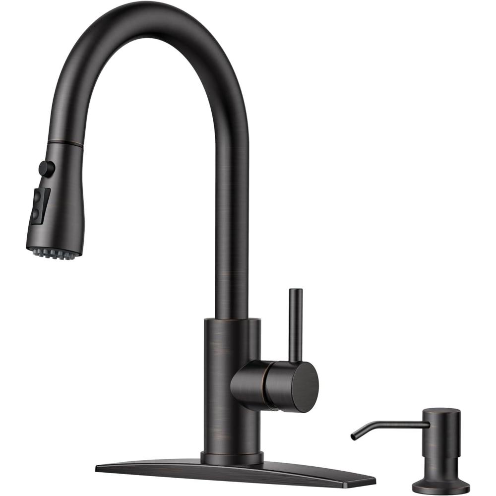 imageFORIOUS Black Kitchen Faucet with Soap Dispenser and Pull Down Sprayer Bar High Arc Single Handle Classic 3 Modes Stainless Steel Faucet for Kitchen Sink Farmhouse RV Laundry CamperOil Rubbed Bronze