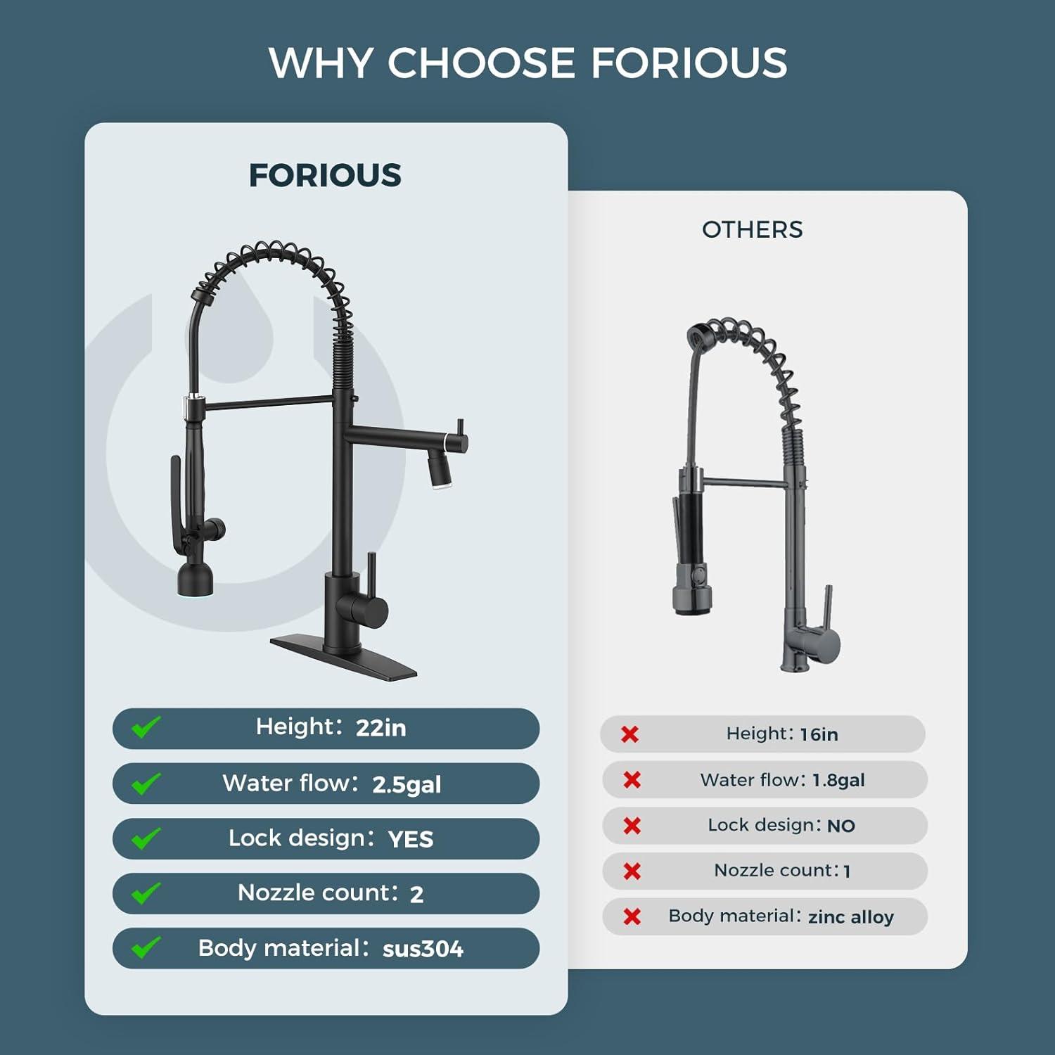Two Independent Nozzles – FORIOUS kitchen sink faucet has two independent nozzles, which is a great option to have both the pot filler and spray nozzle. To turn on the water, the handle and nozzle must be turned on simultaneously, providing a double safety guarantee that keeps kids and pets from freely opening the faucet.