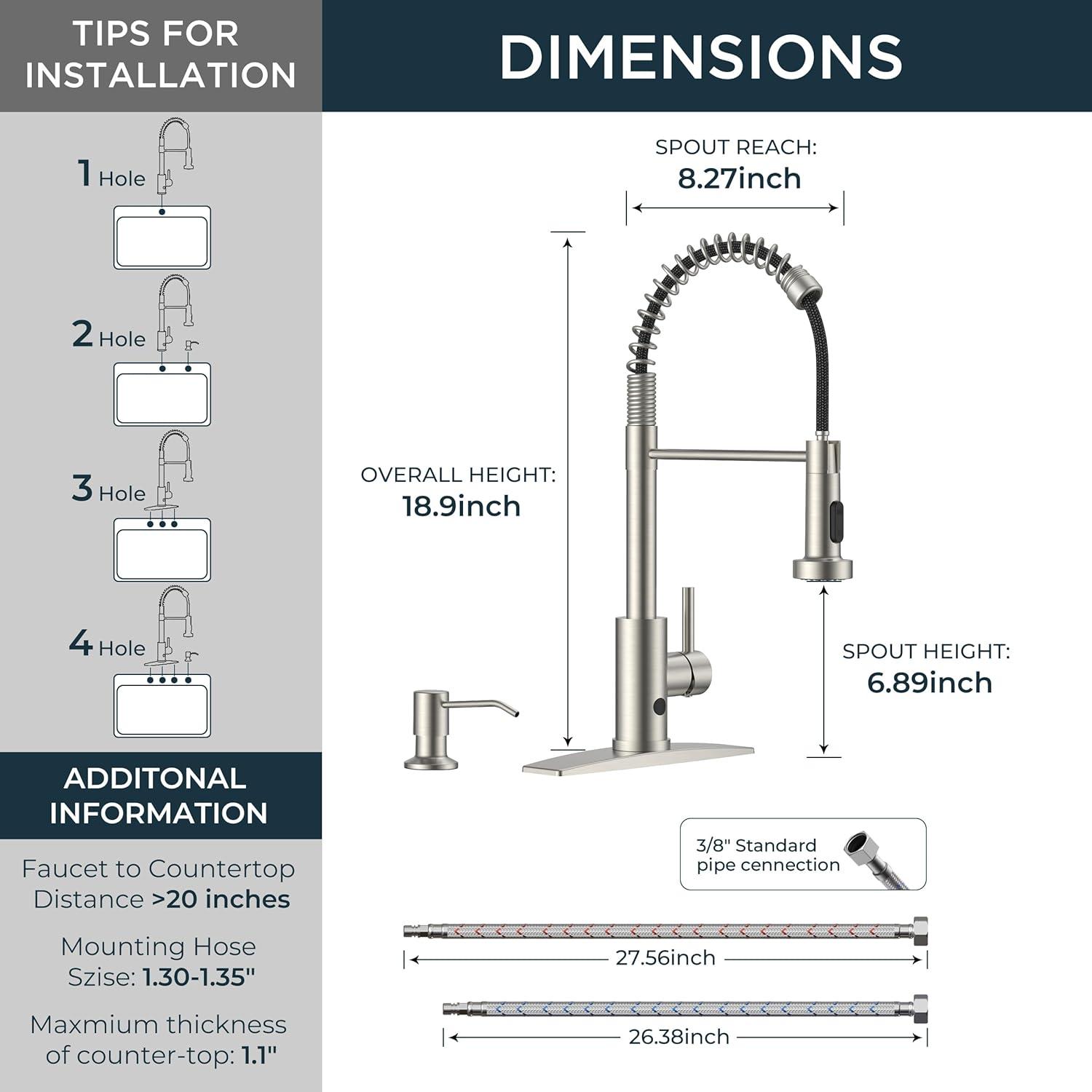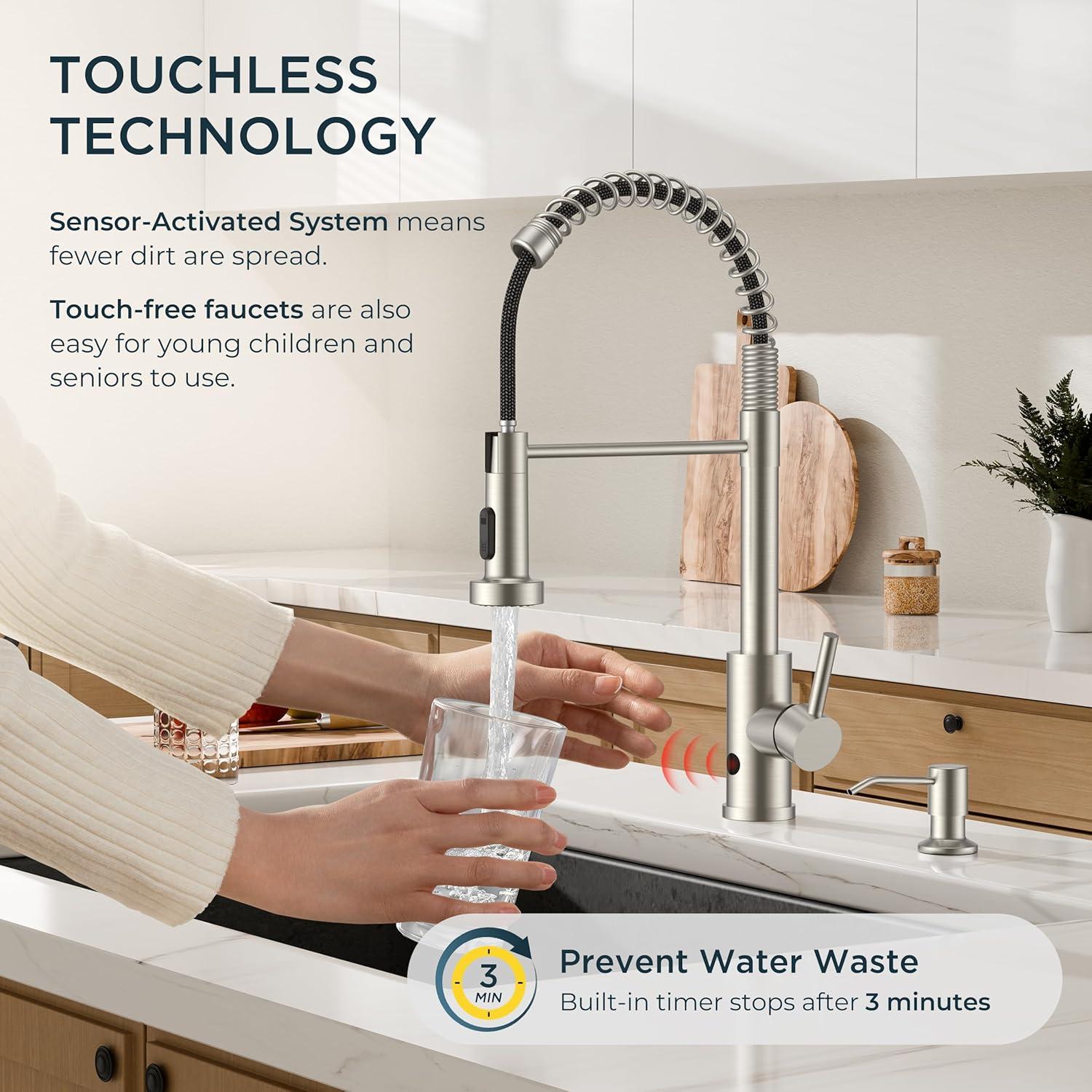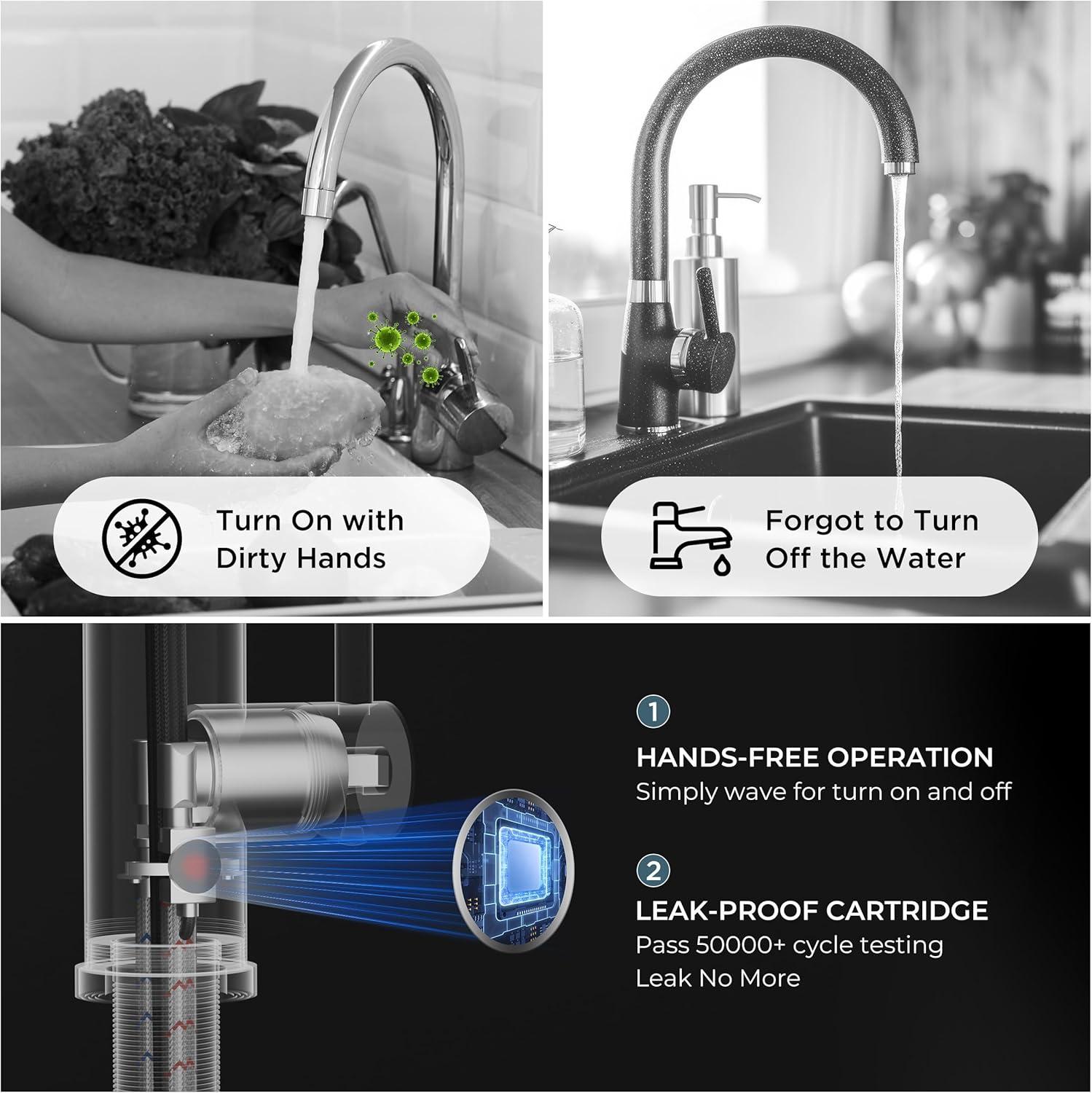 【Instant Touchless Operation】 Wave your hand in front of the faucet, and the water will turn on or off. No dirty switch-touching. Auto-off after 3-min inactivity saves water and prevents accidental runs. NOTE: pls check sizes at first