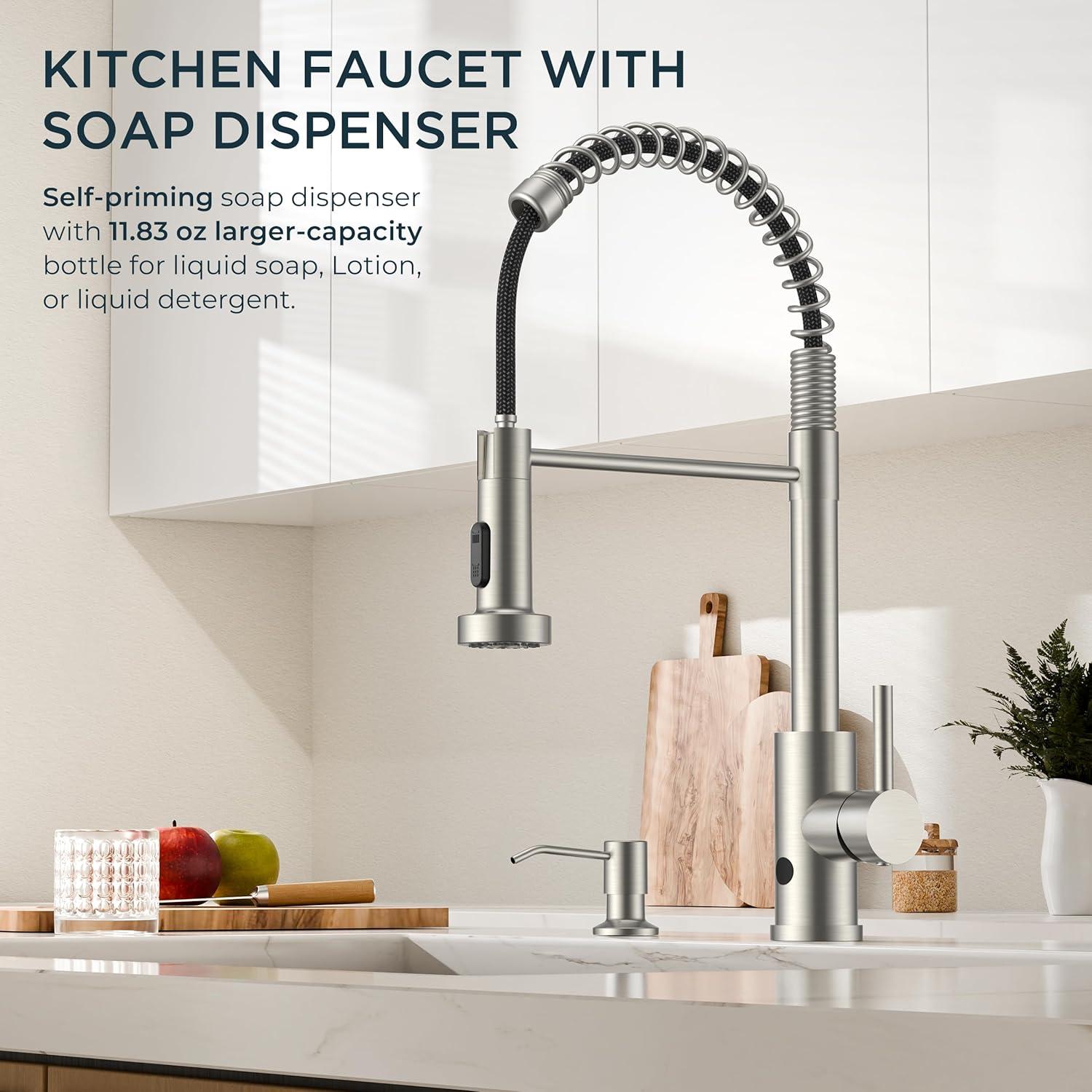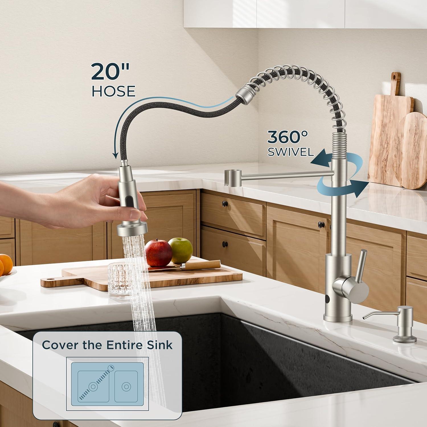 【Commercial Faucet Set】A high-arc spout and 360°swiviel creates a professional touch to any kitchen. Includes a 11.83 oz /350 ML large-capacity soap dispenser for easy access at the sink, streamlining cleaning and keeping the area tidy