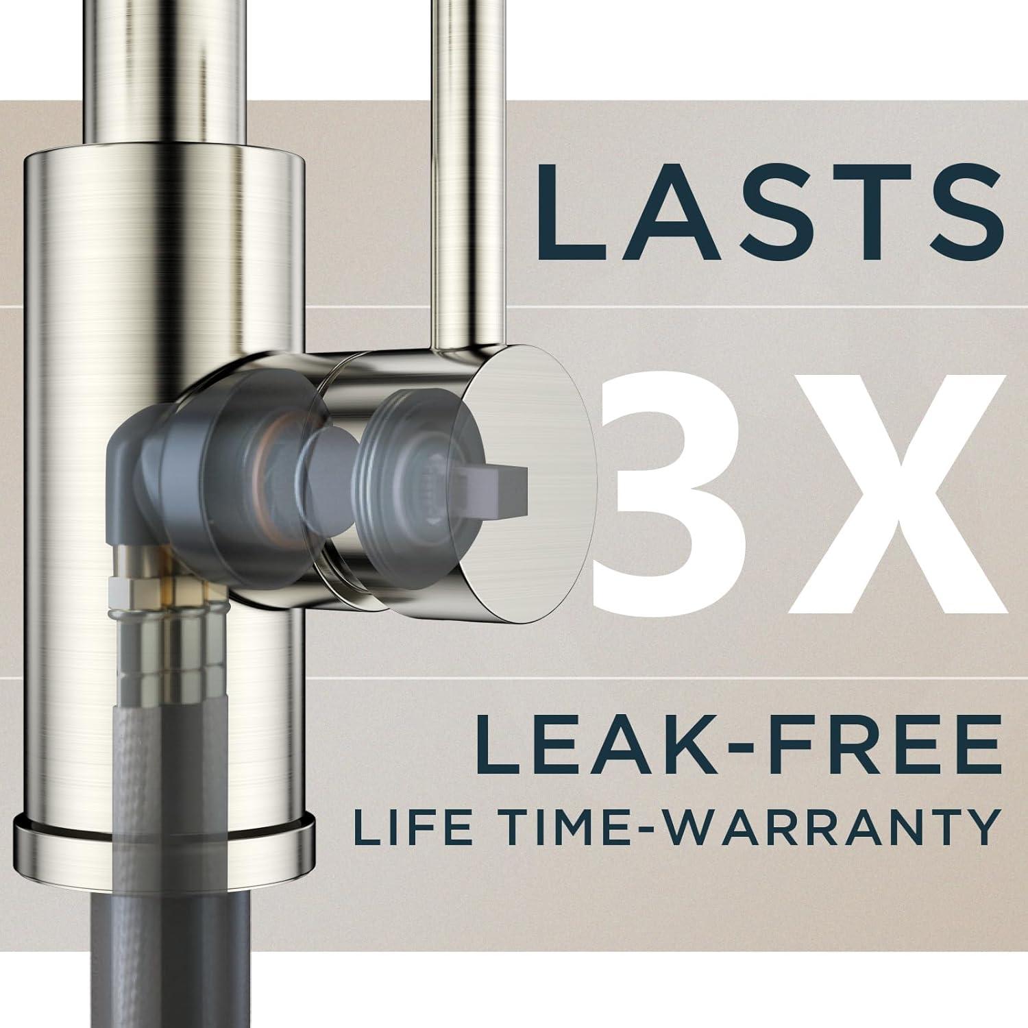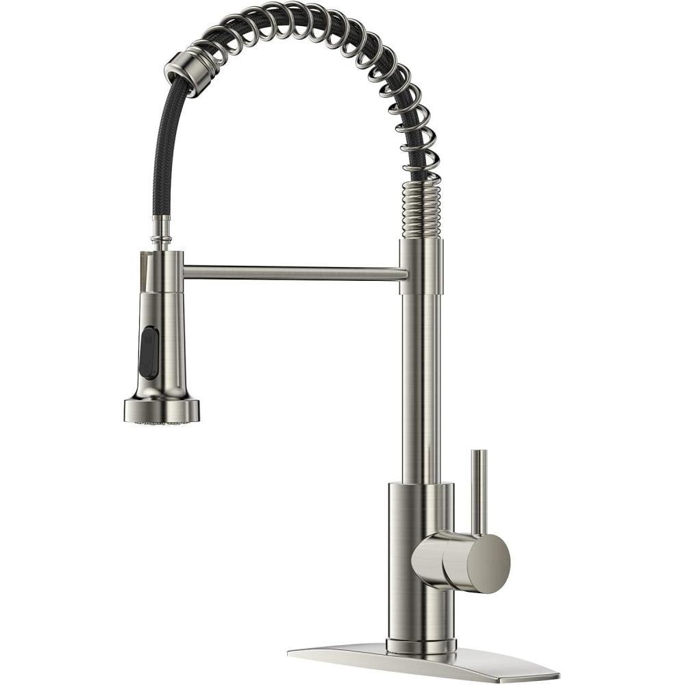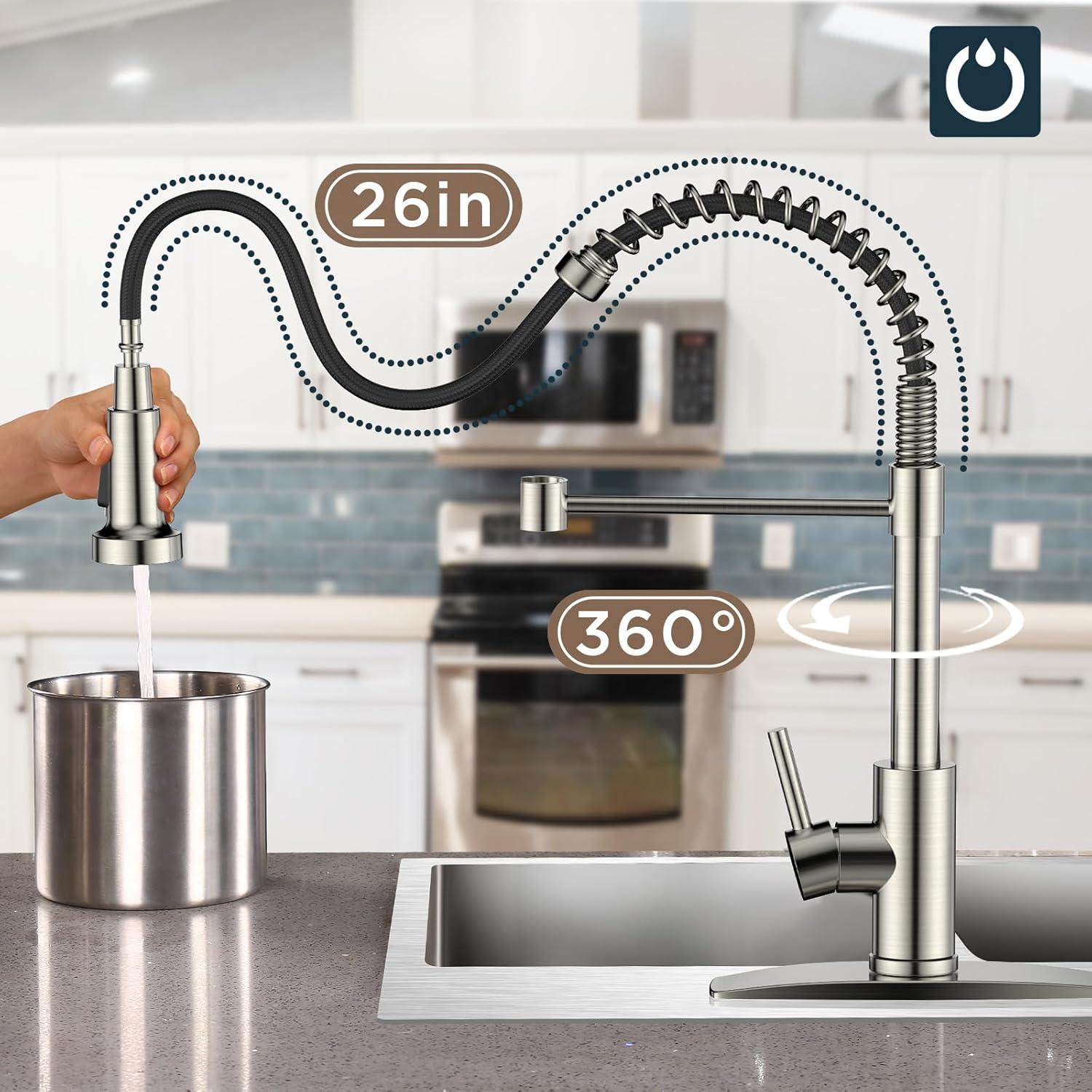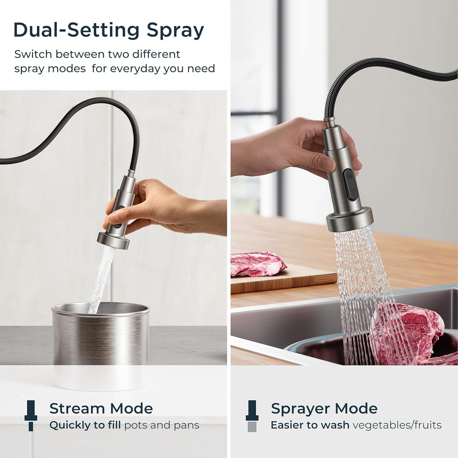 【Two-Function Sprayer】The kitchen faucet with pull down sprayer for added reach. Switch between a gentle stream for filling pots and a powerful spray for tough cleaning. This offers unmatched flexibility to handle all your kitchen tasks