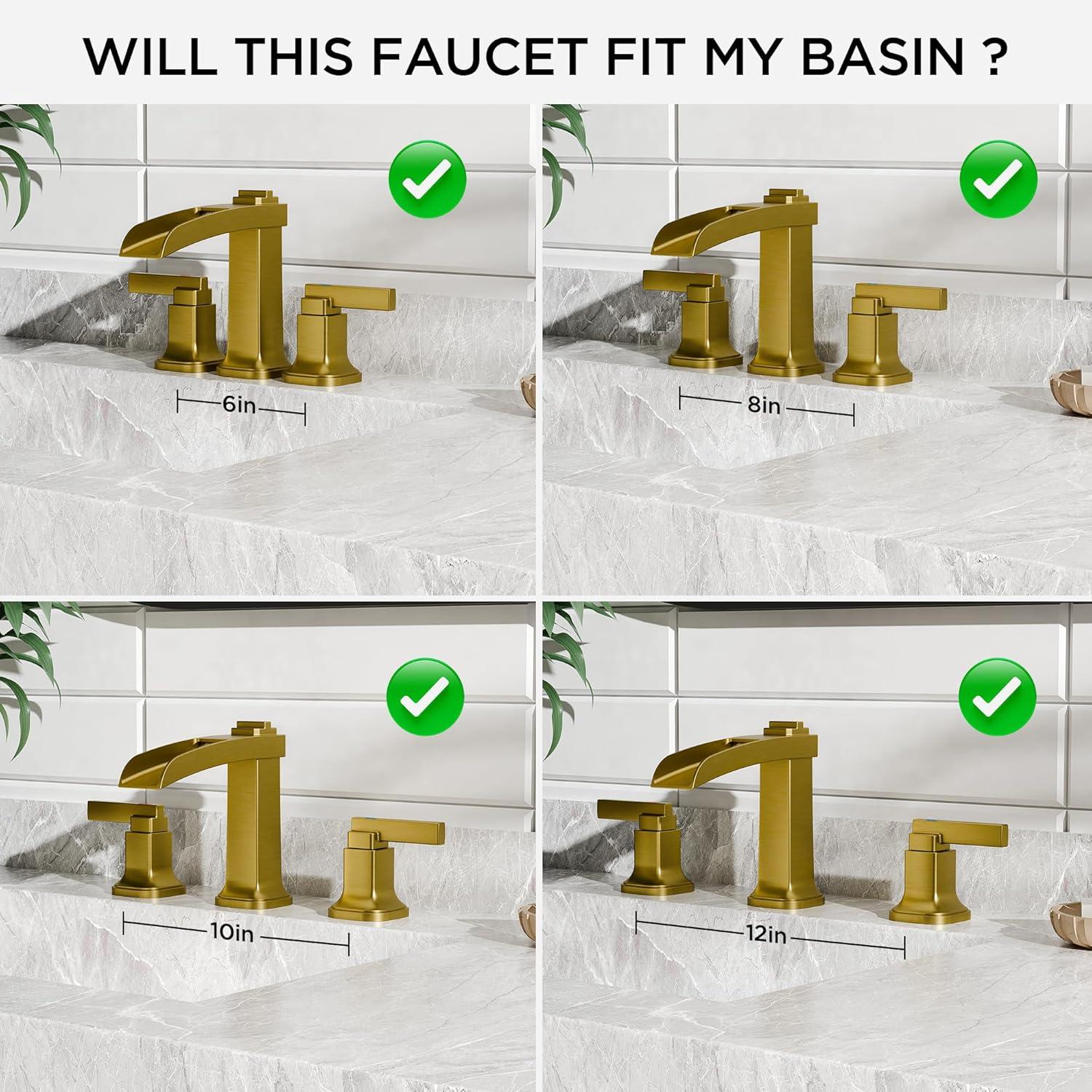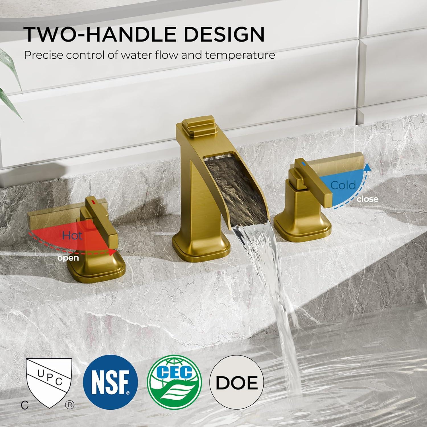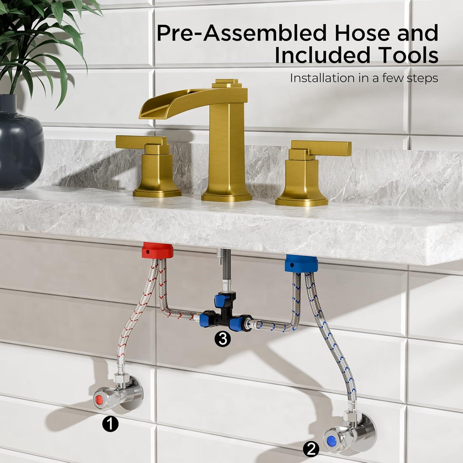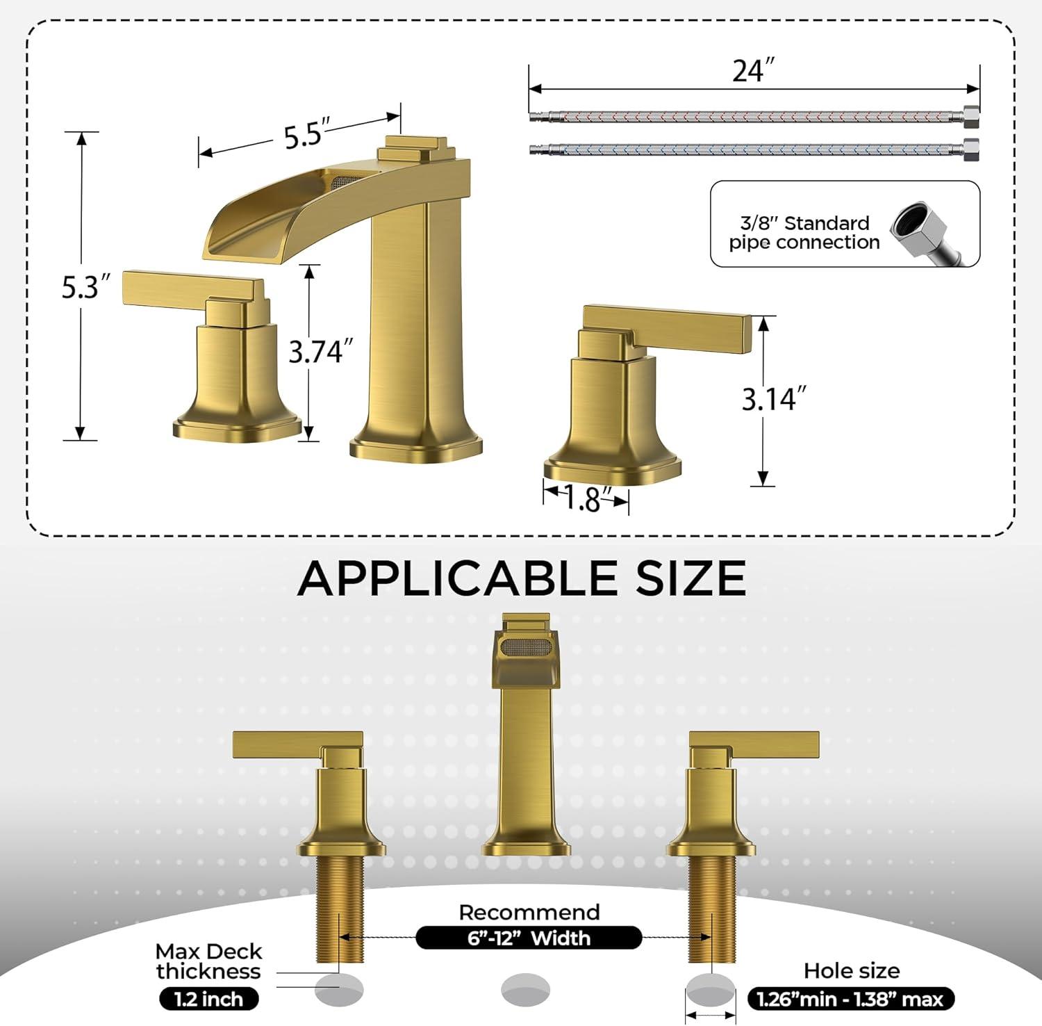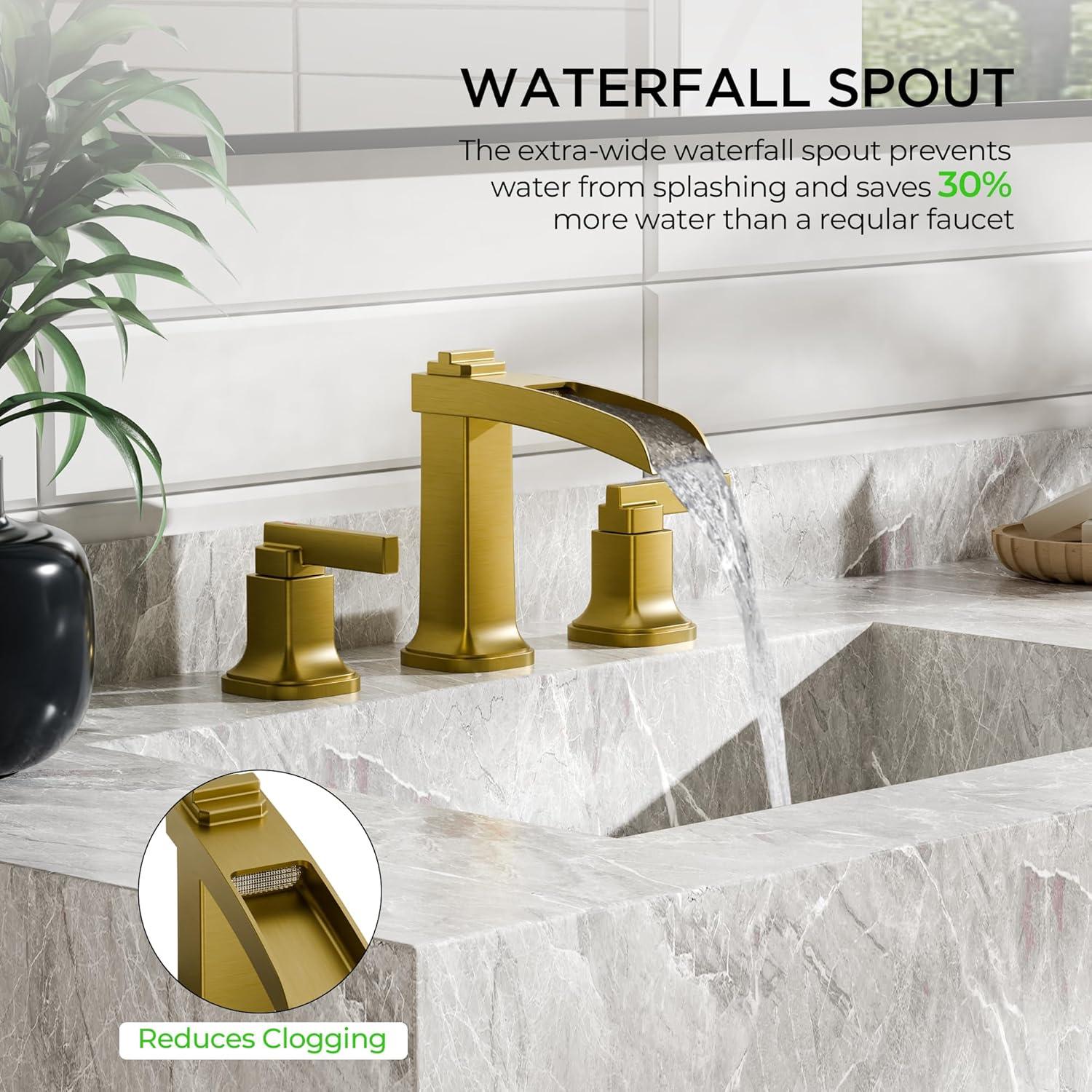 FORIOUS Brass Matte Black Commercial Bathroom Faucets 3 Hole, Waterfall Modern Widespread 8 Inch Bathroom Sink Faucet with Metal Pop-up Drain and Pre-Assembled Hose for Vanity, Restroom,Bathtub(Brushed Gold)