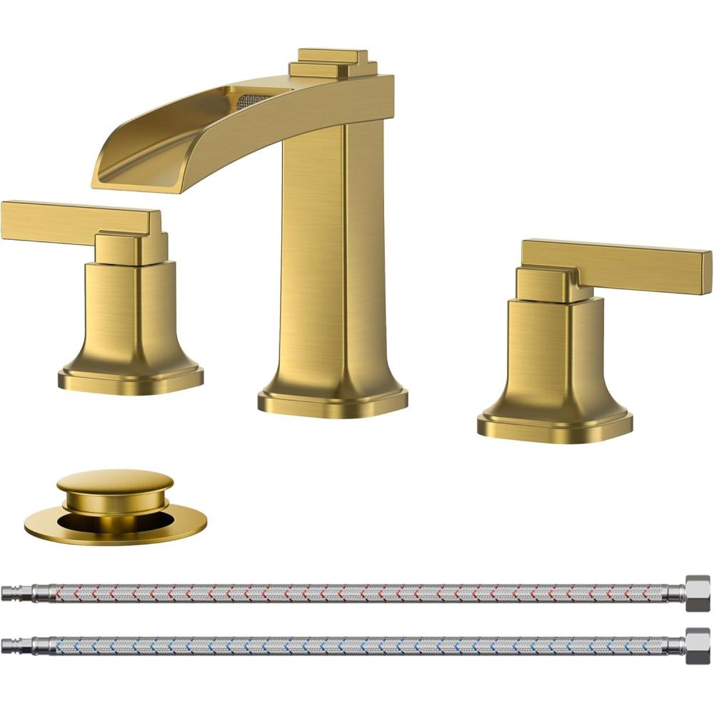 imageFORIOUS Brass Matte Black Commercial Bathroom Faucets 3 Hole Waterfall Modern Widespread 8 Inch Bathroom Sink Faucet with Metal Popup Drain and PreAssembled Hose for Vanity RestroomBathtubBrushed Gold