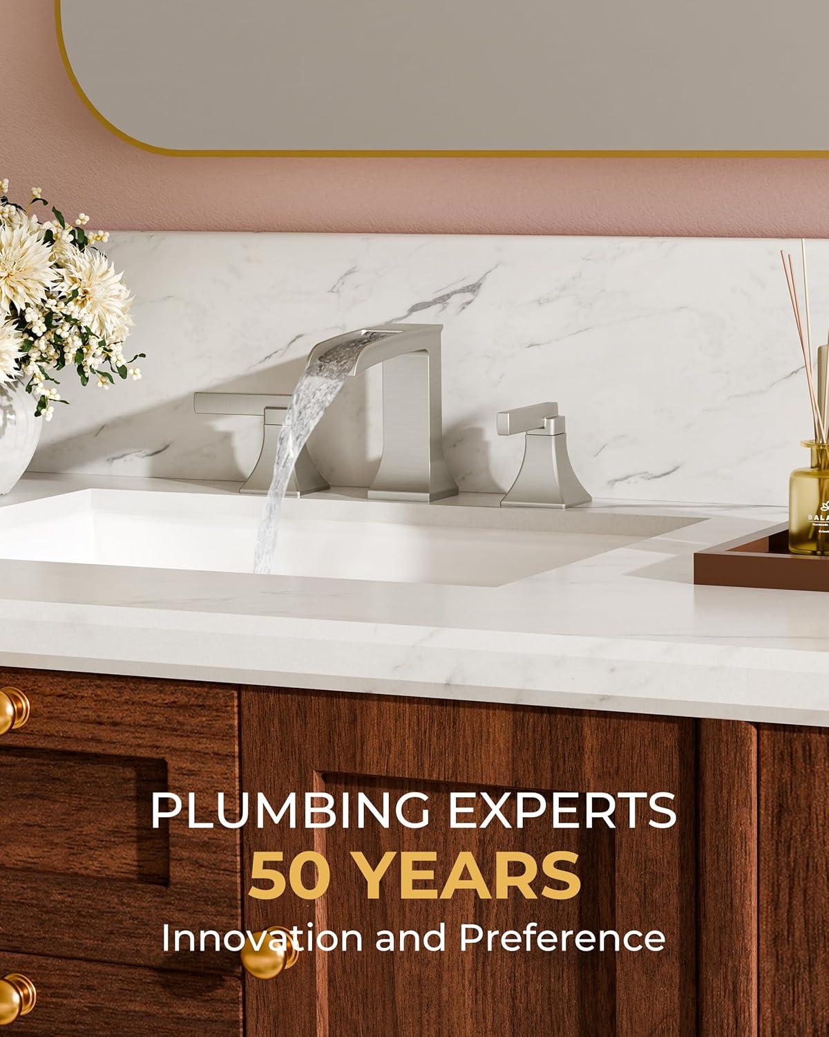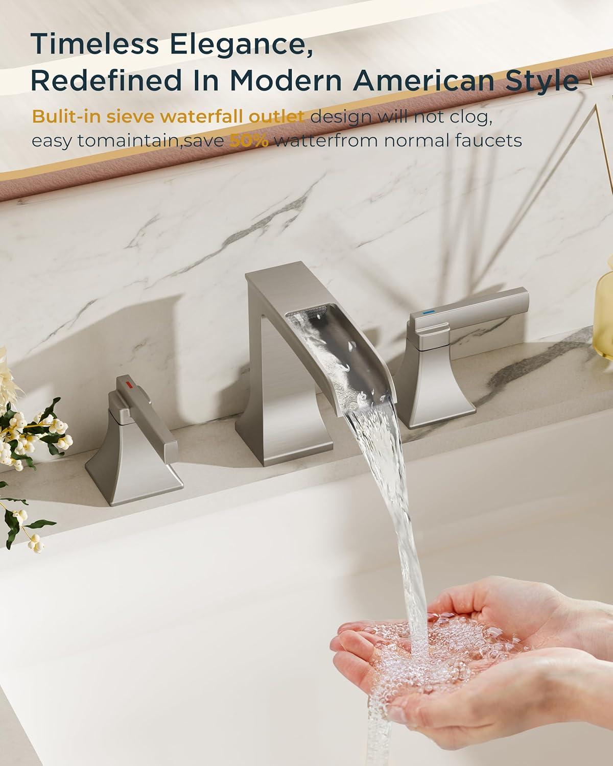 IMMERSIVE WATERFALL EXPERIENCE: Sleek geometric design widespread bathroom faucet enhances space aesthetics. Scientifically angled waterfall spout prevents backsplash while creating serene, mini spa-like moments during daily washes