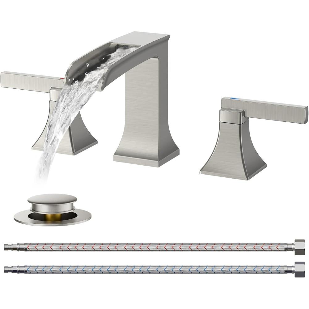 imageFORIOUS Brass Waterfall Bathroom Faucet for Sink 3 Hole 2 Handle Square 8 Inch Matte Black Bathroom Faucet Widespread with Popup Drain and CUPC Flexible Hoses VanityBrushed Silver