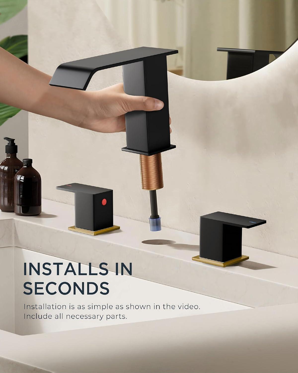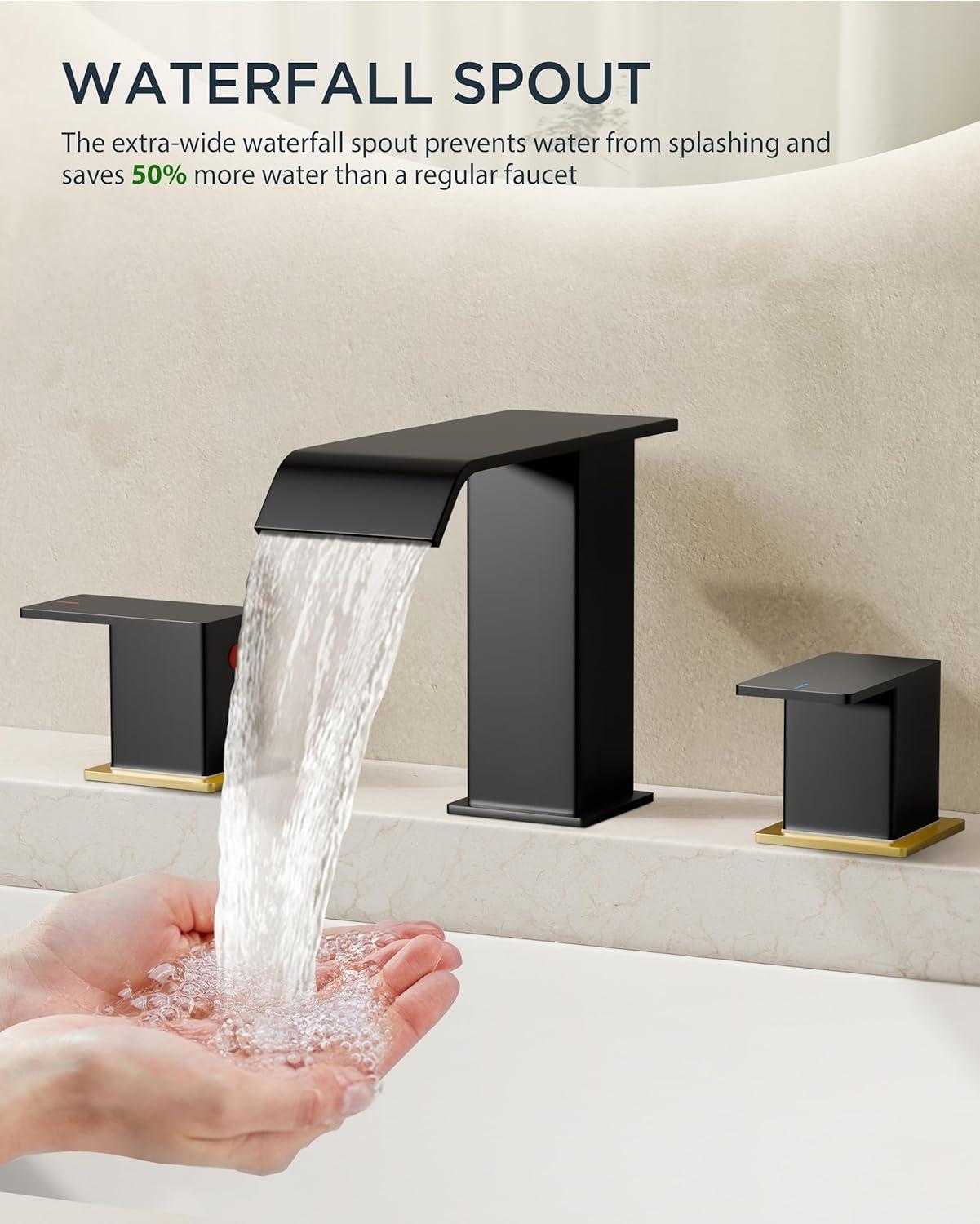 WIDE WATERFALL SPOUT: The spout of this widespread bathroom faucet extends far and has a scientific tilt angle, so you don't have to worry about water backing up onto the countertop or splashing. This bathroom faucet bulit-in sieve can provide water splashing and save 50% from normal faucets